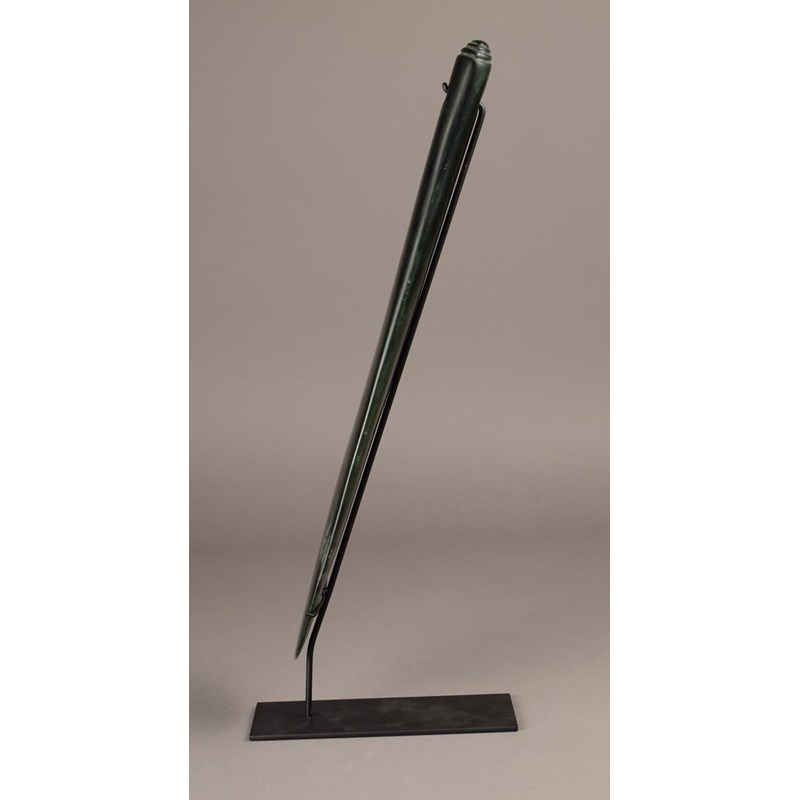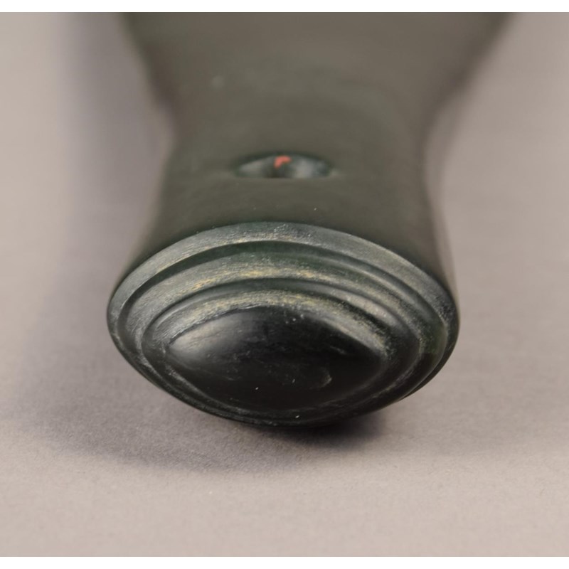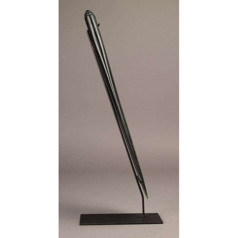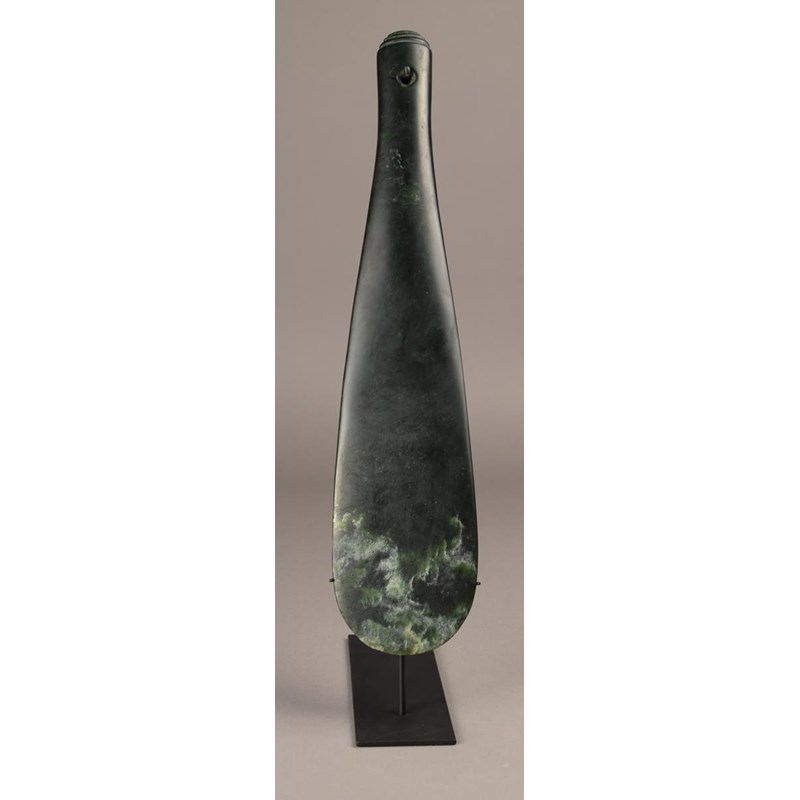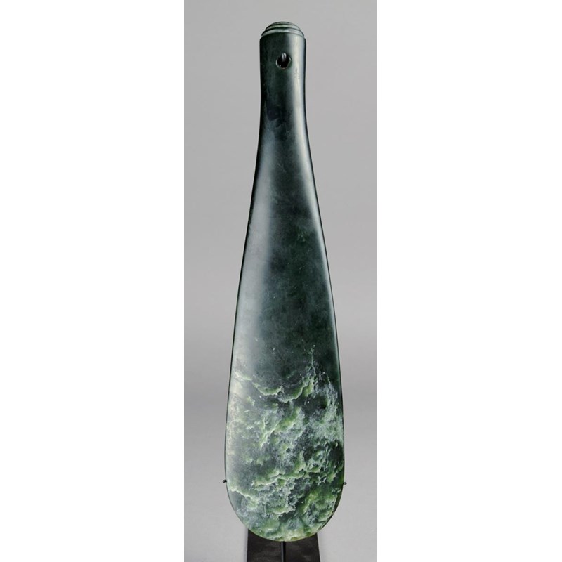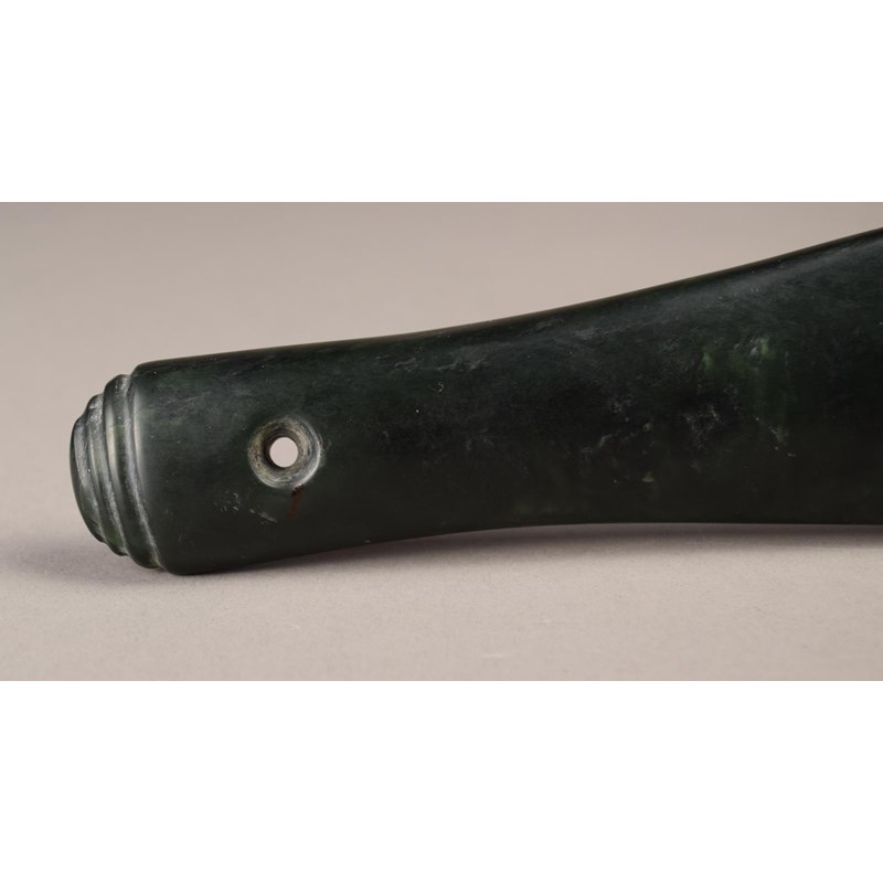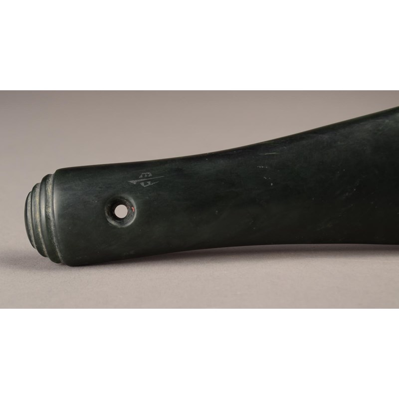 greenstone of flattened spatulate form with a suspension hole and an eliptical tiered butt, with makers monogram,