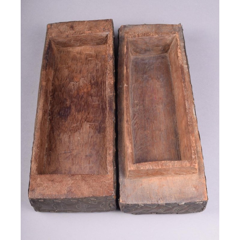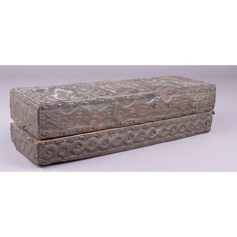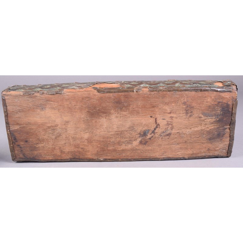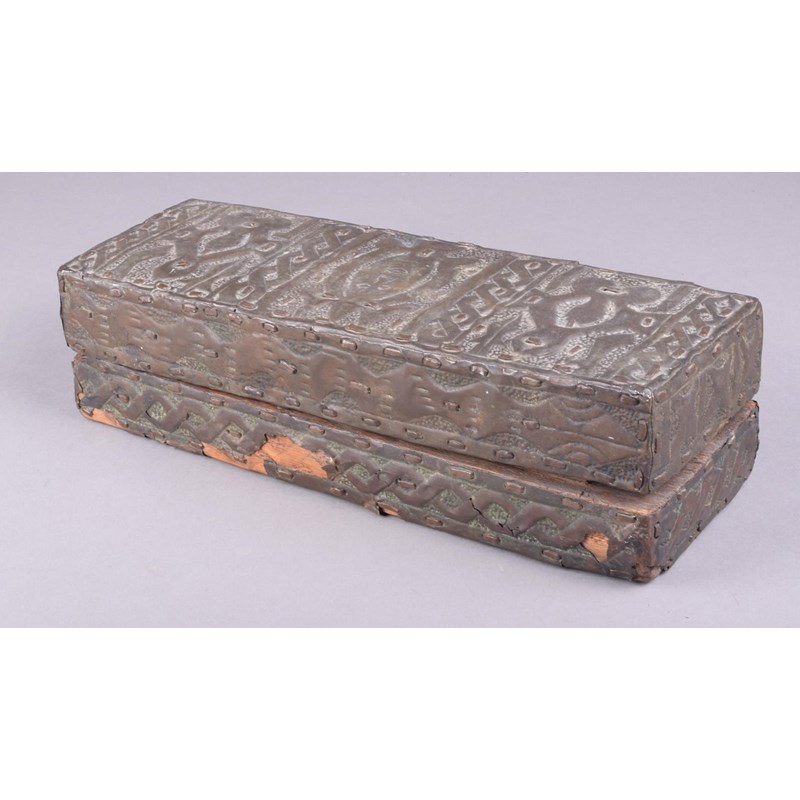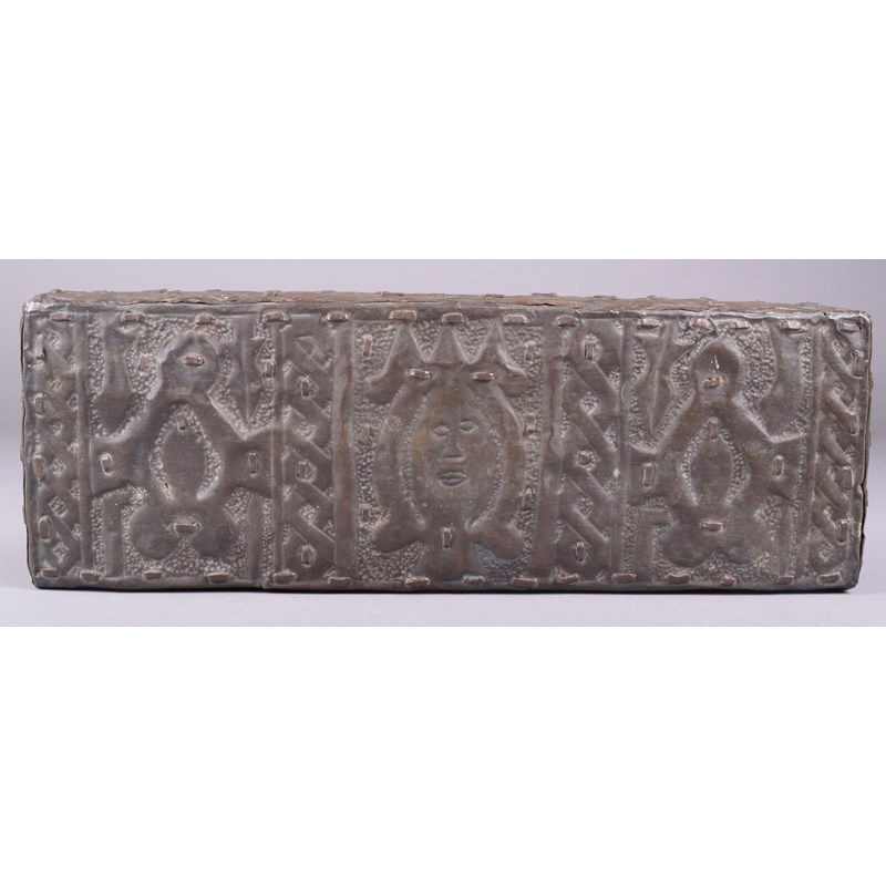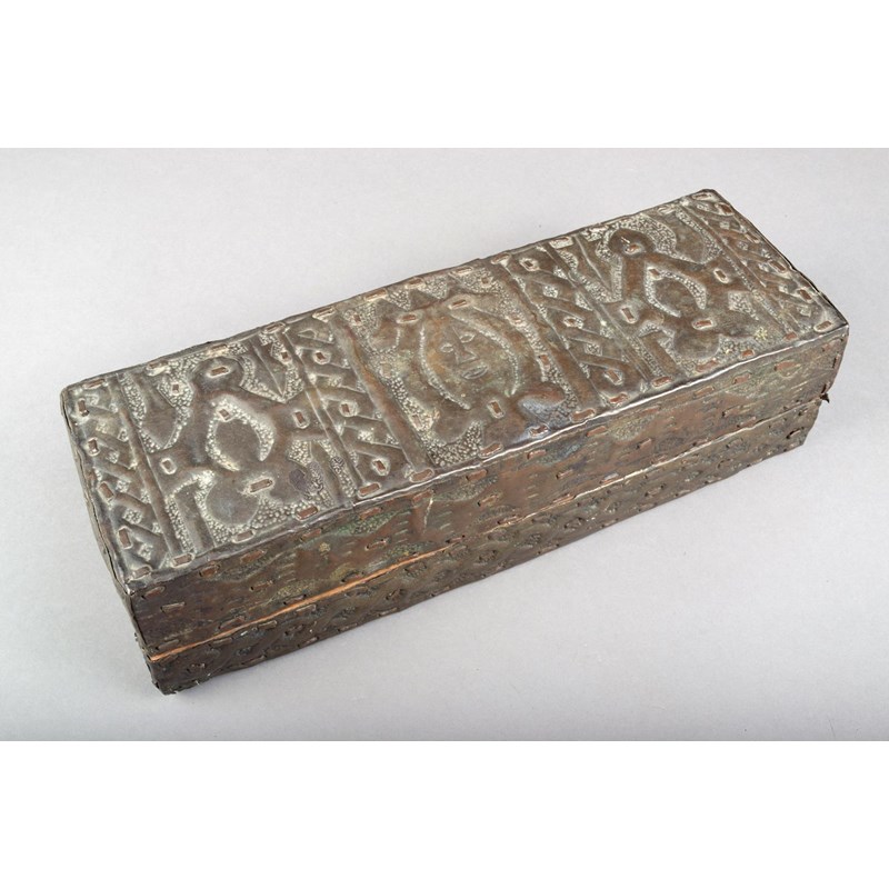 A Benin wood and sheet brass mounted rectangular box, the top decorated with a Portuguese mask, flanked by images of swords, with geometric pattern borders, the metal applied with staples, 33cm long.