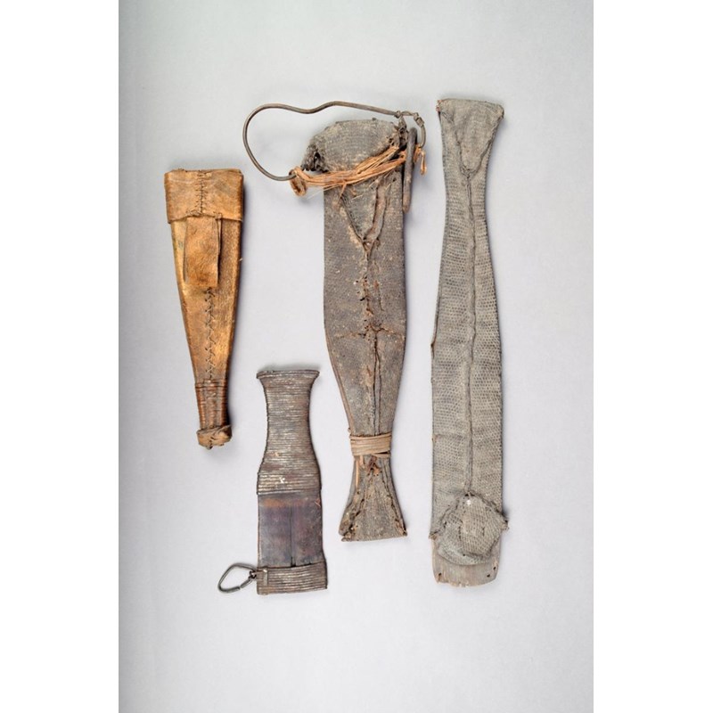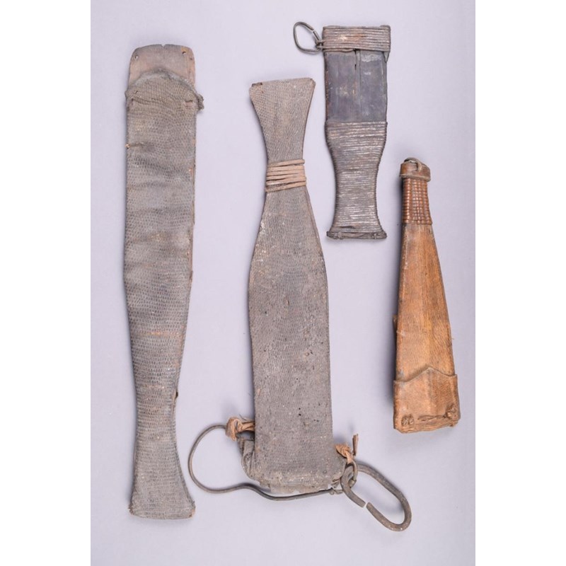 Four Fang knife scabbards, Gabon; two covered with reptile skin, one with vellum and the fourth with metal wire, 40cm, 33.5cm, 21cm and 18cm long. (4)