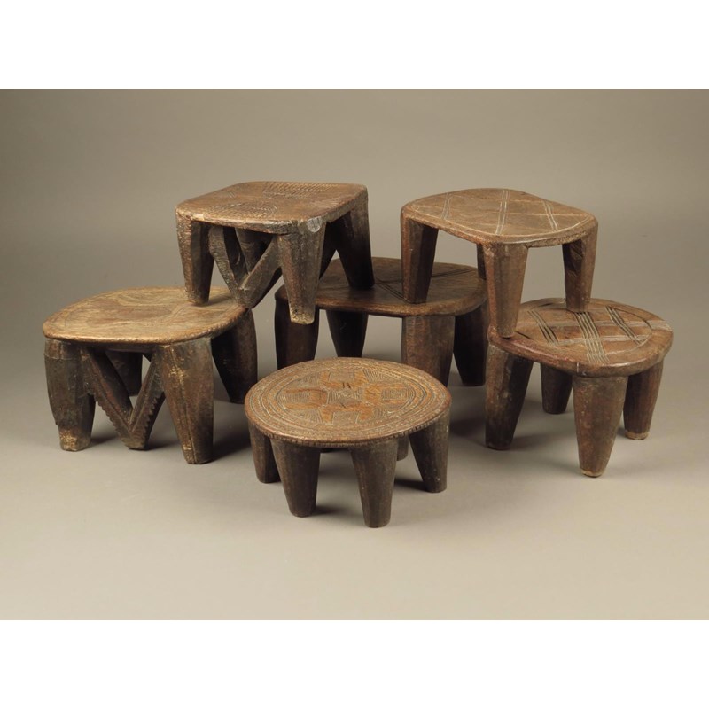 Six Nigerian wood stools, with geometric patterned tops, two with 'V' shape supports, the highest 14.5cm. (6)