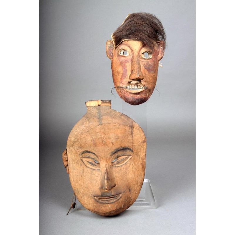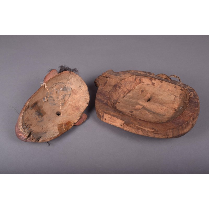 A Makonde mask, Tanzania, with applied animal hair, with remains of red pigment, 20.5cm high, and a Dayak carved wood mask, 28cm high. (2)