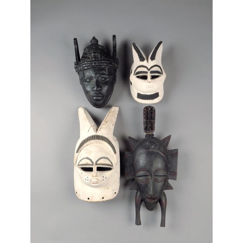 An Ekpo mask, Nigeria, with horned headdress to a circular face with scarifications, with a white pigment finish, 33cm high, a smaller similar mask, a Senufo mask and a Benin carved ebony head. (4)
