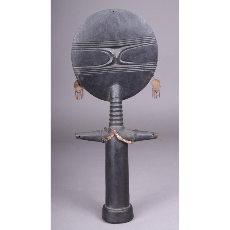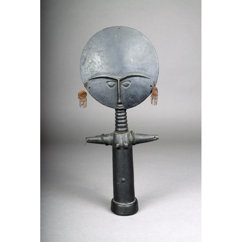 An Ashanti Akuaba doll, Ghana, the reverse of the head with carved linear decoration, with stamped brass earrings and beads, 30.5cm high.
