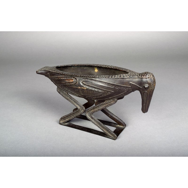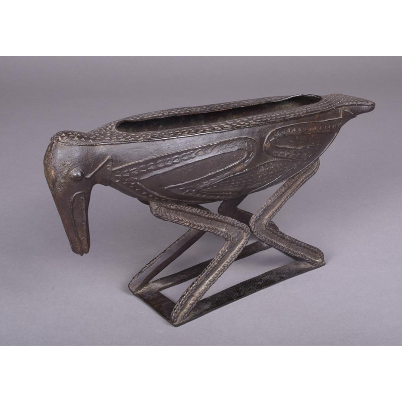 A Bamileke bronze bird vessel, Cameroon, with triangular impressed pattern, 33cm long.