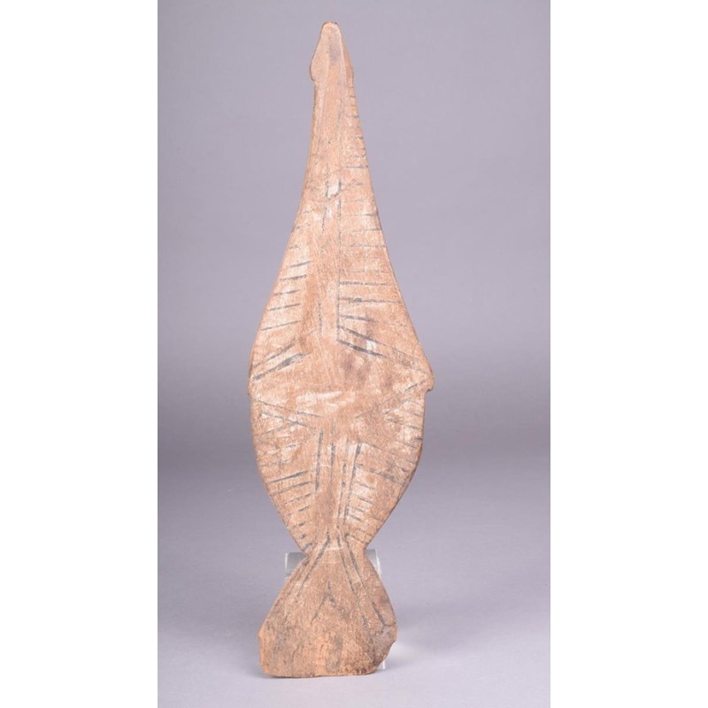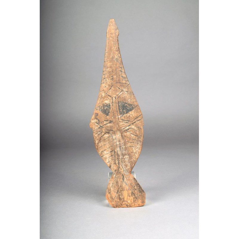 A Santa Cruz ceremonial implement, Solomon Islands, carved in the form of a fish with black pigment linear decoration, 33.5cm long.