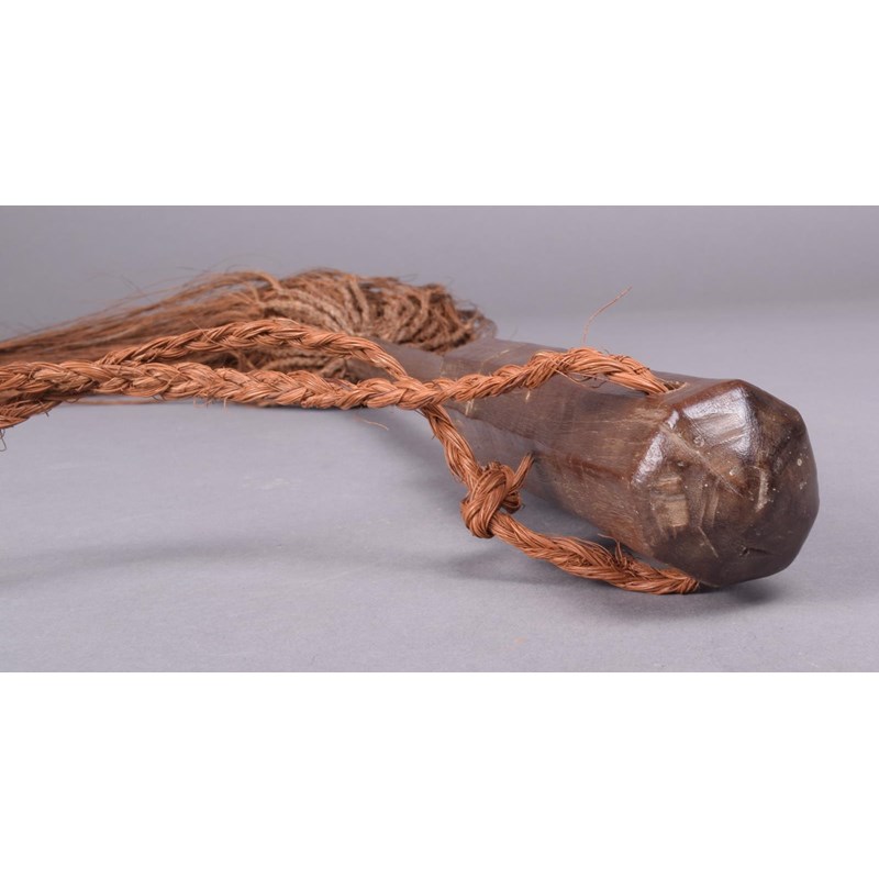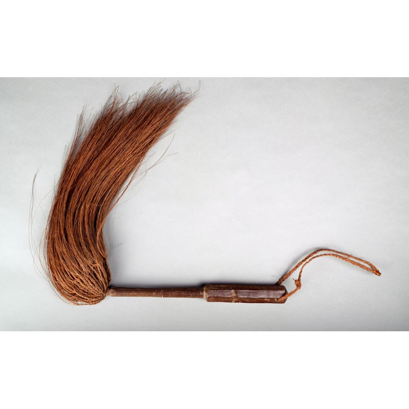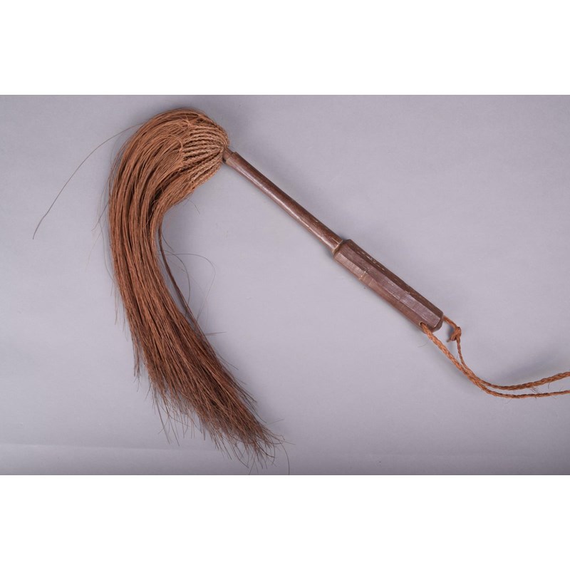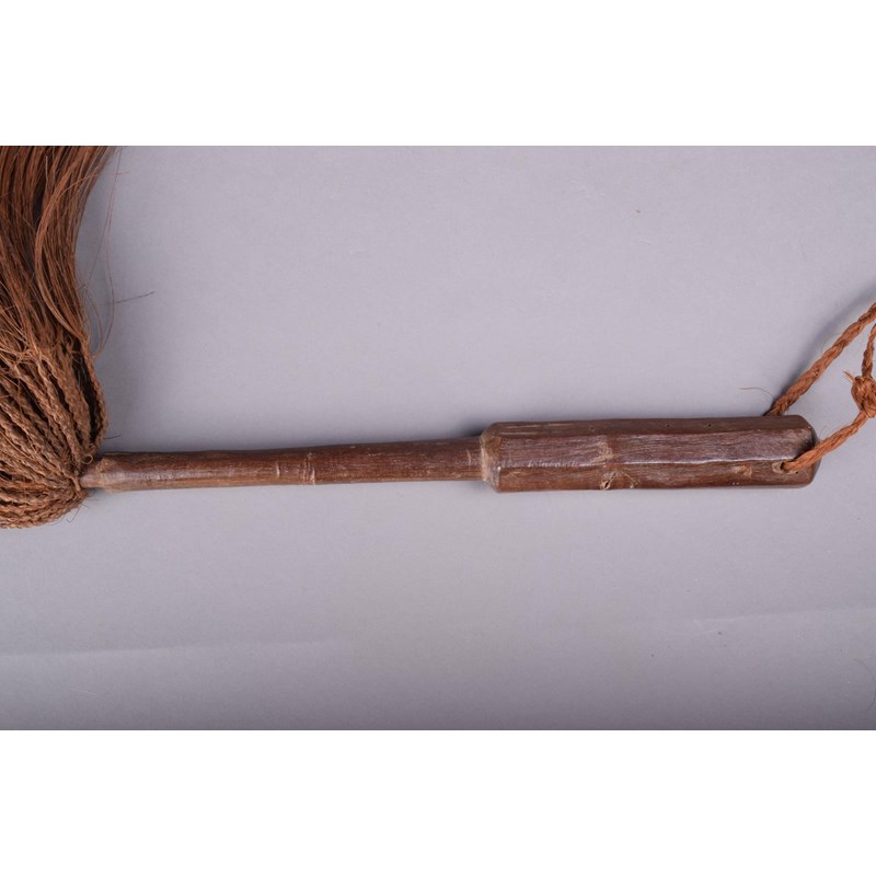 A Fiji fly whisk, wood and coir sennit fibre, with a faceted handle and tapering cylindrical shaft, 34cm long.