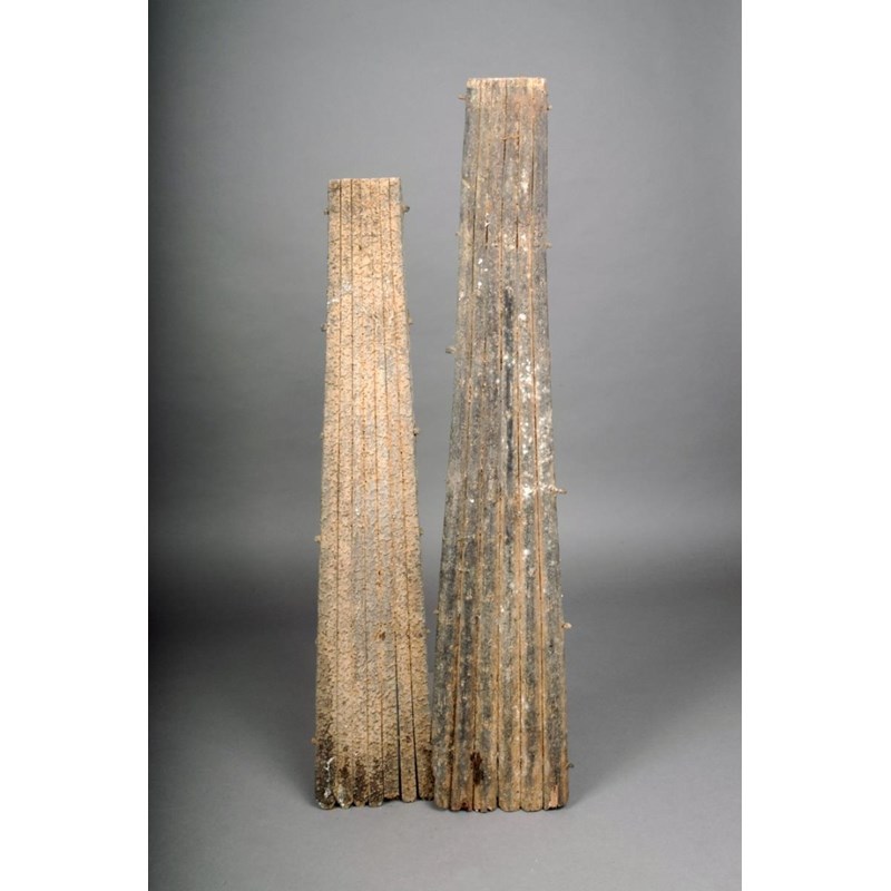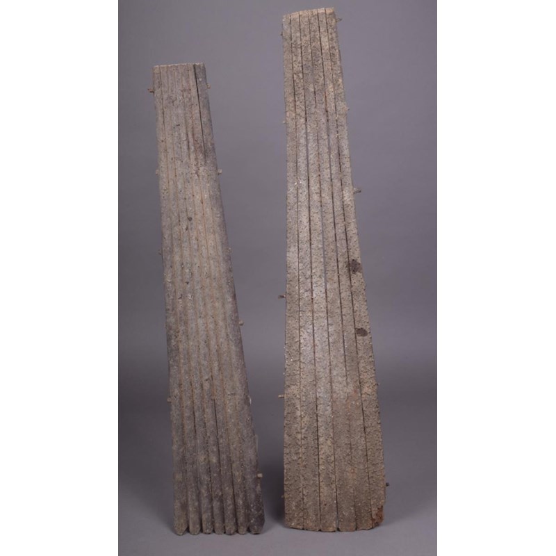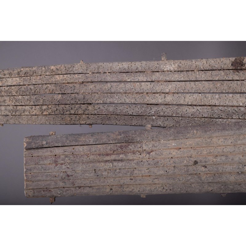 Two Polynesian food graters, constructed with tapering cut reeds and pegged together with the flat side covered in tiny nodules, 72cm and 64cm long. (2)