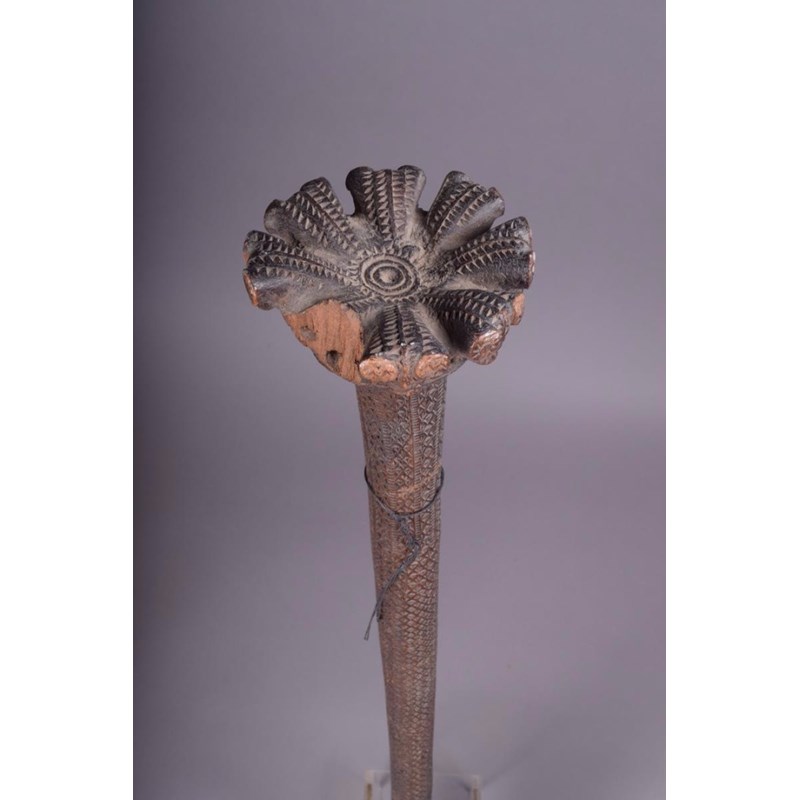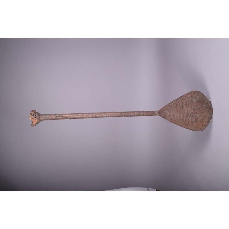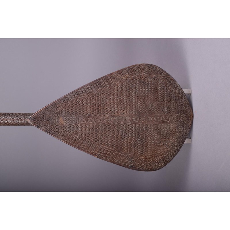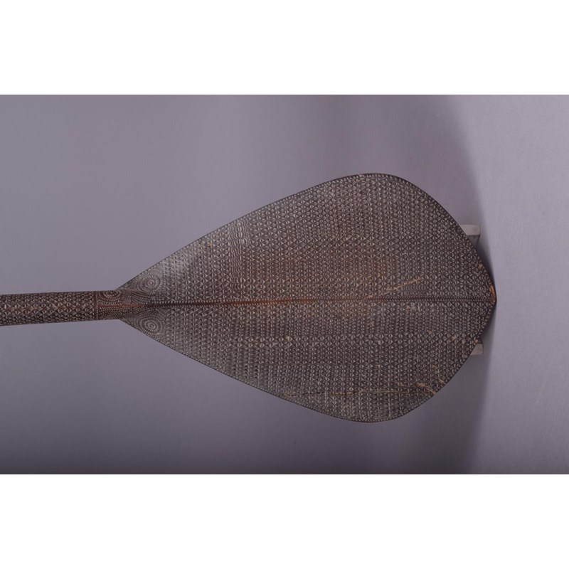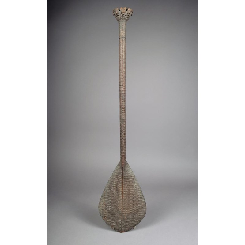 An Austral Islands paddle, Polynesia, all over carved X's with sun motifs, dog tooth and semi circles, with a fig shape blade and circular shaft terminating in a flared pommel carved dancing girls, 88cm long.