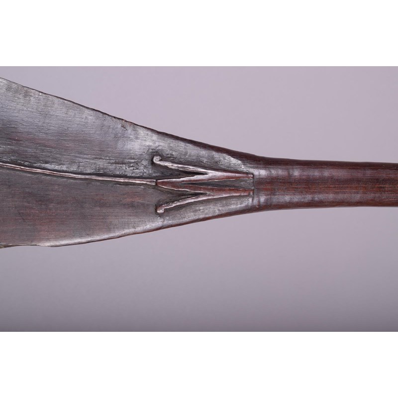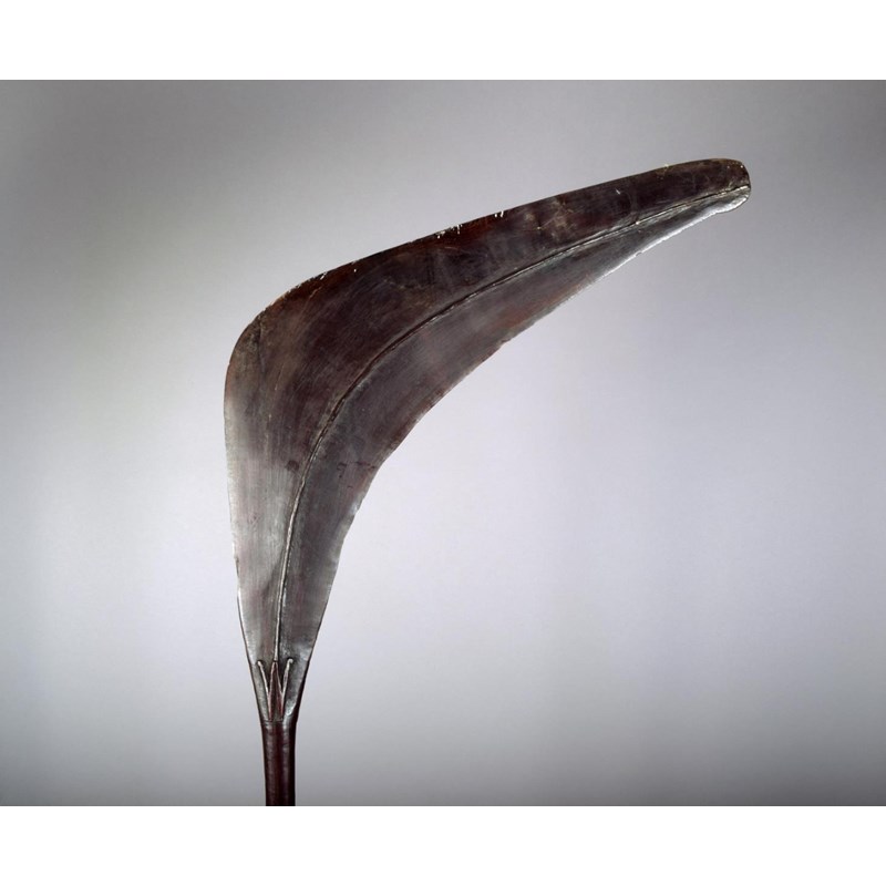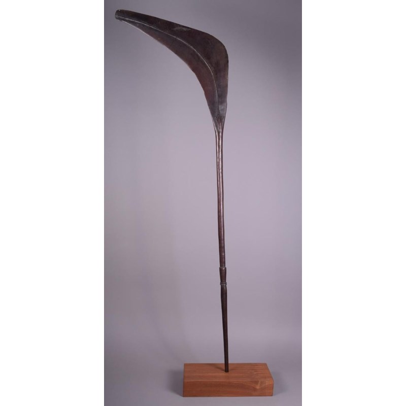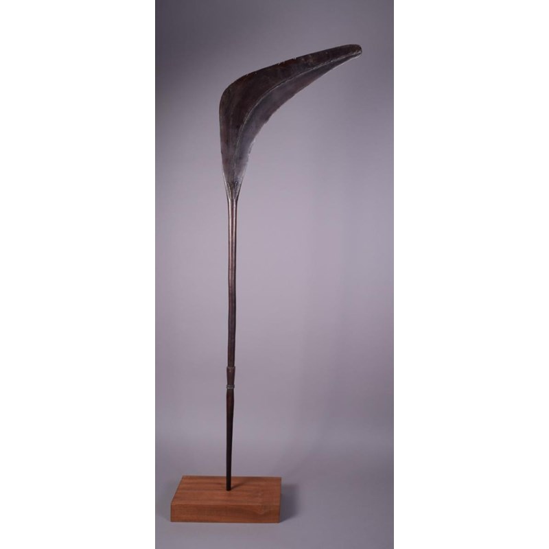 A Solomon Islands dance paddle, with a crescent blade and medial ridge terminating in a W symbol, representing frigate birds, with a knopped tapering shaft, 159.5cm long, with a stand. (2)