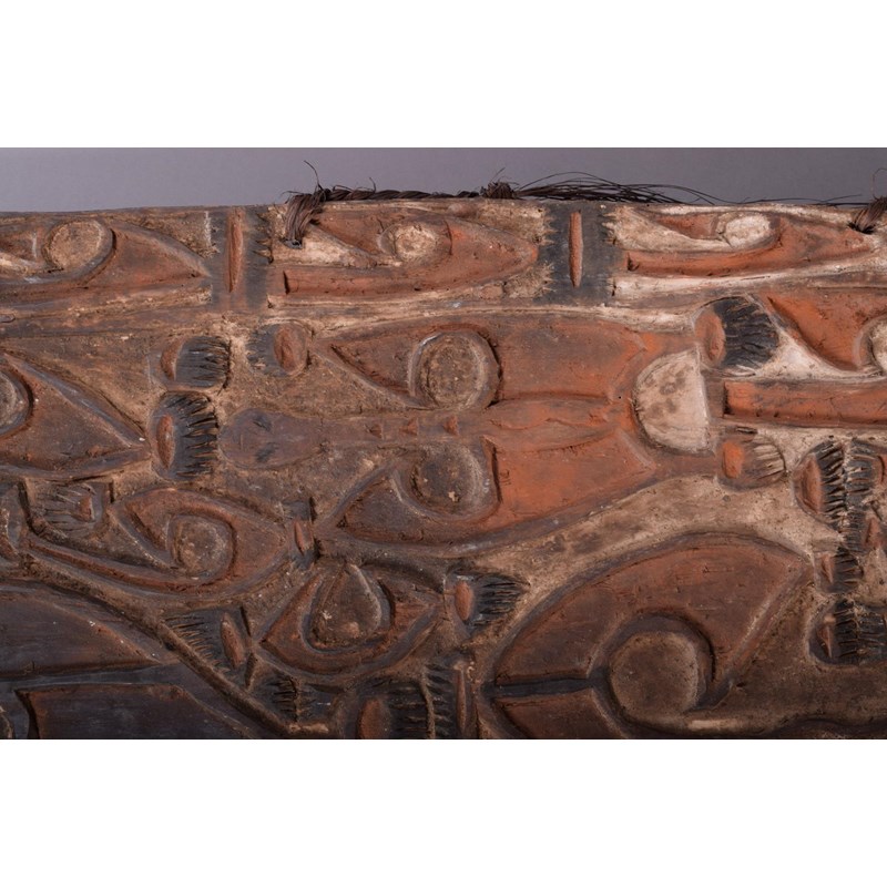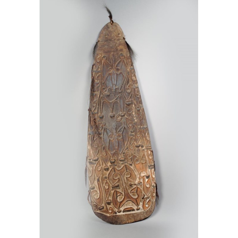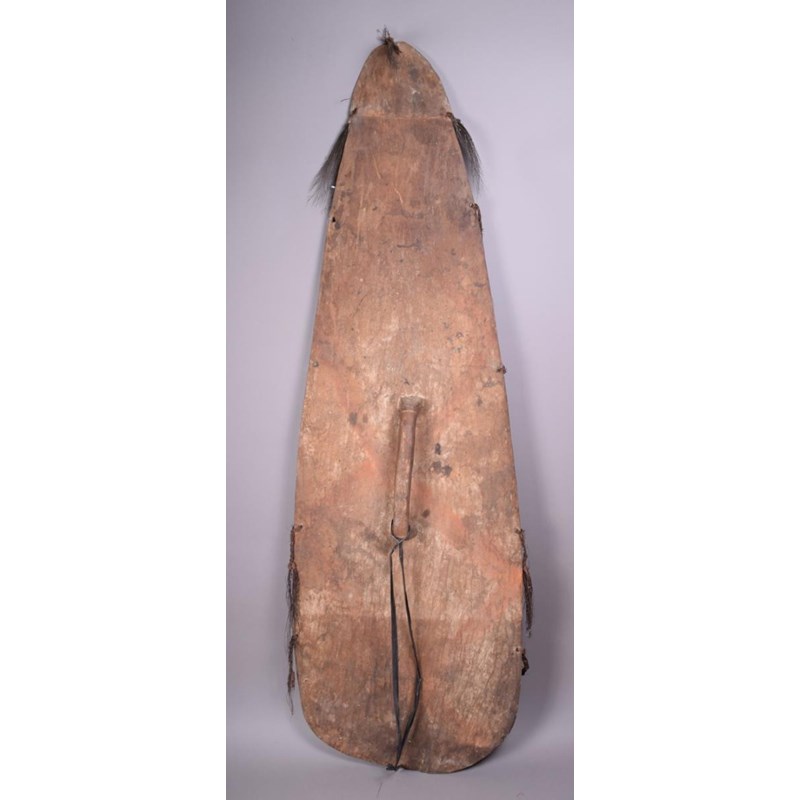 An Asmat shield, Papua New Guinea, relief carved figures, with remains of pigment decoration and tied feathers, the reverse integral handle and geometric pigment decoration, 175cm high.