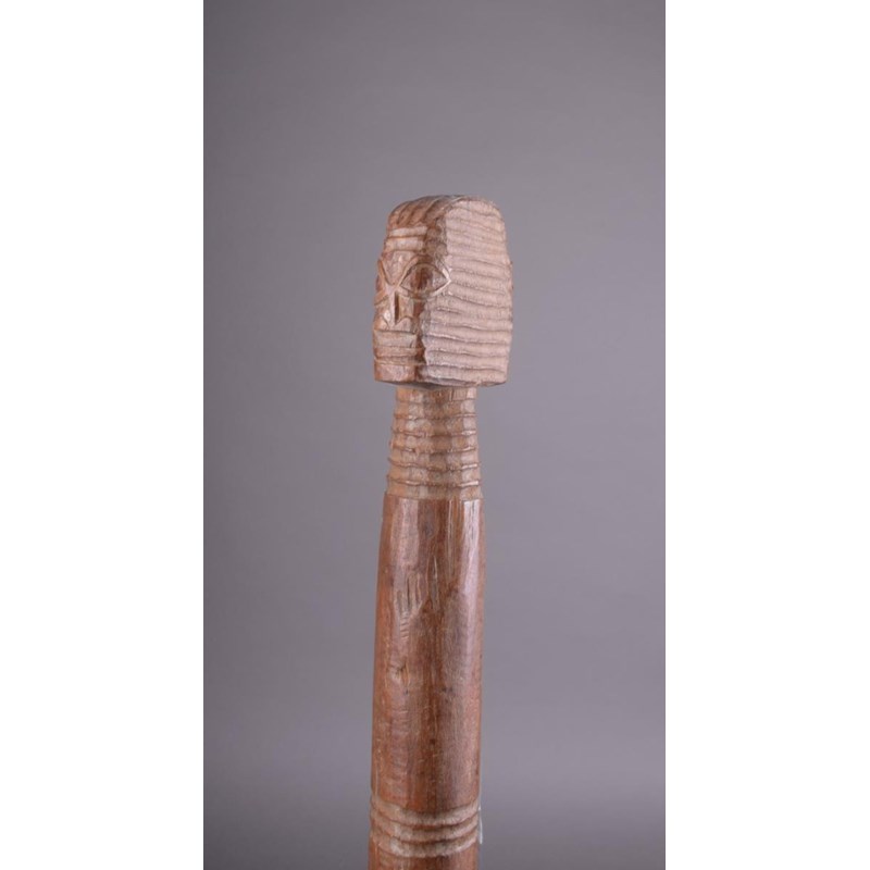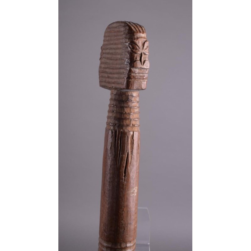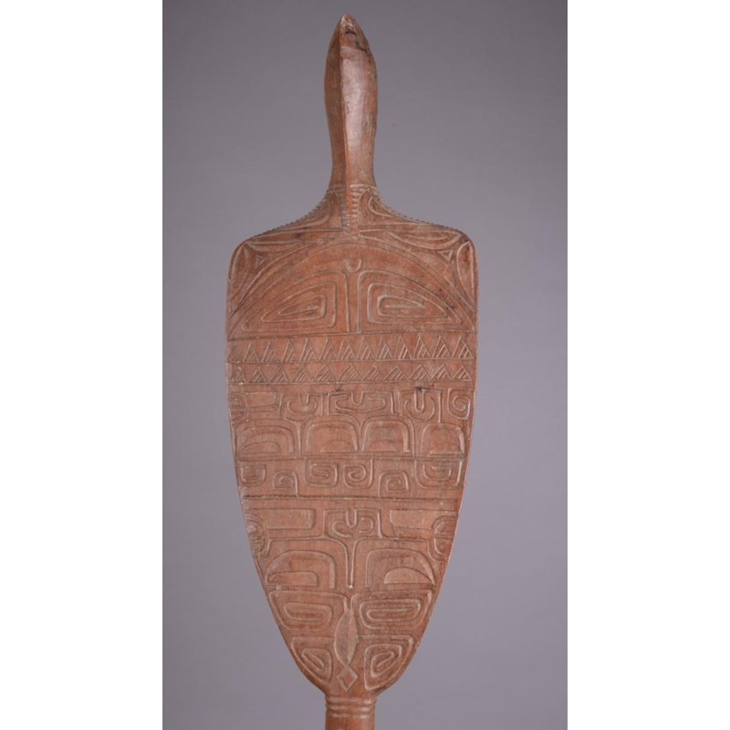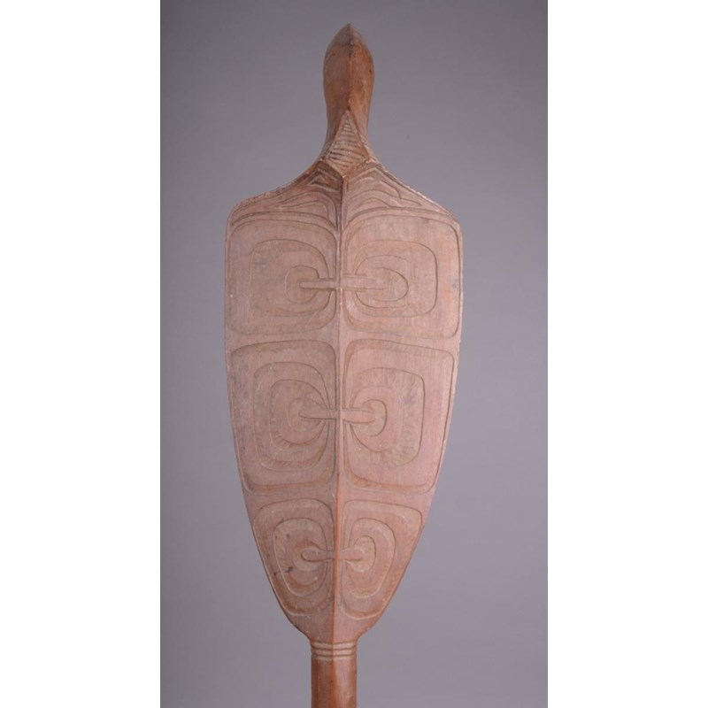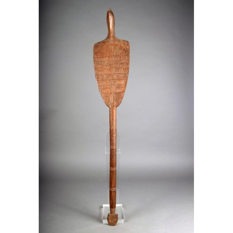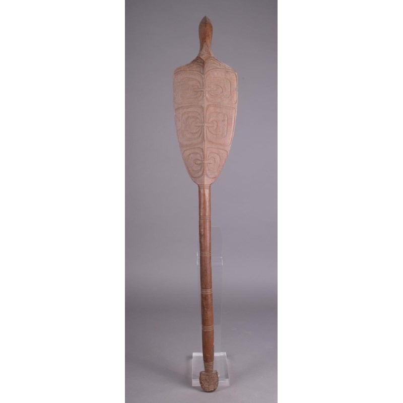 A Marquesas Islands ceremonial paddle, the blade with shaped spur and carved decoration, the ribbed shaft with semi-circular finial carved tiki masks, 95cm long.