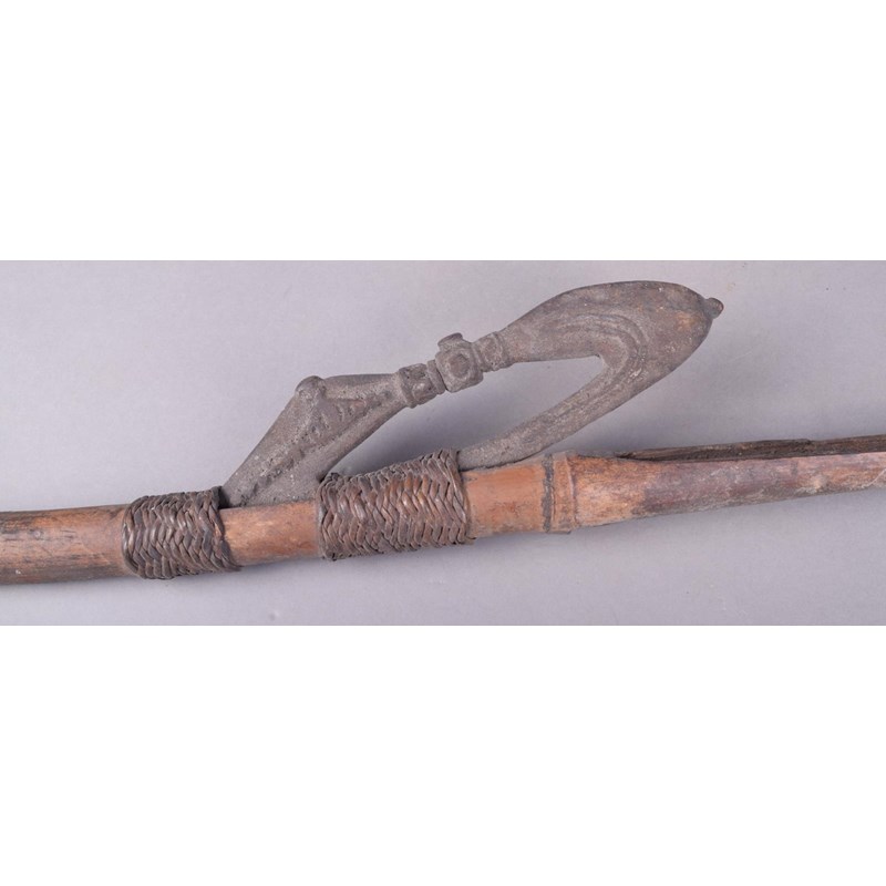 A Papua New Guinea spear thrower, bamboo with a fibre bound guide carved as a stylised bird, 88.5cm long.