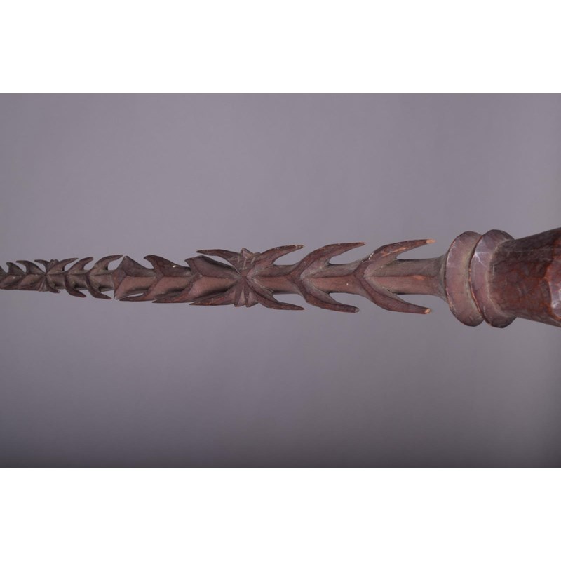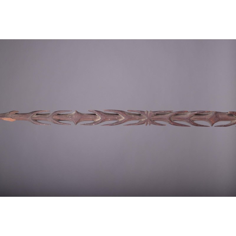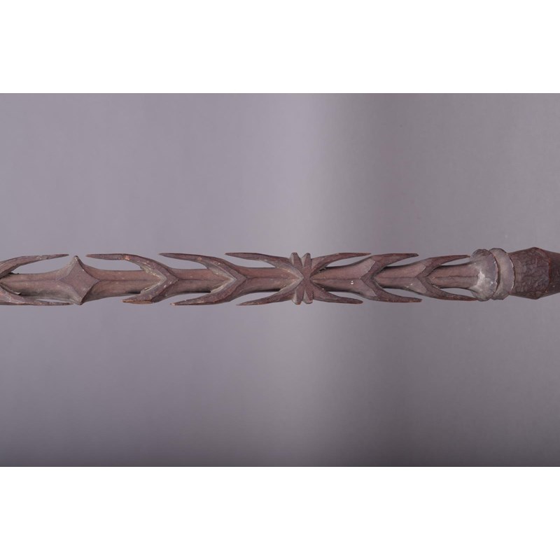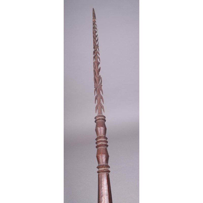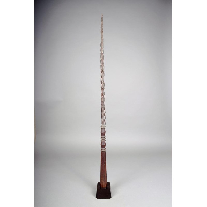A Vanuatu dagger, Melanesia, carved a stepped tip and barbs, with flattened knops and a faceted handle, 85.5cm long, in a stand. (2)
