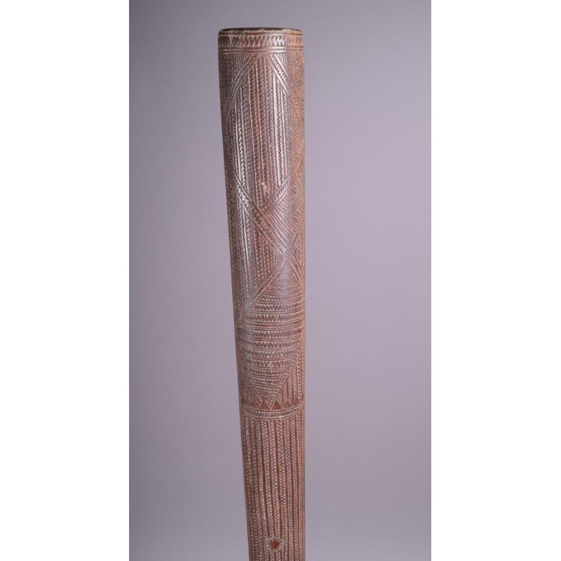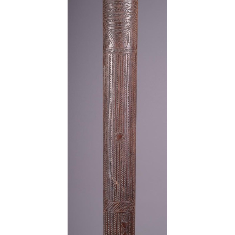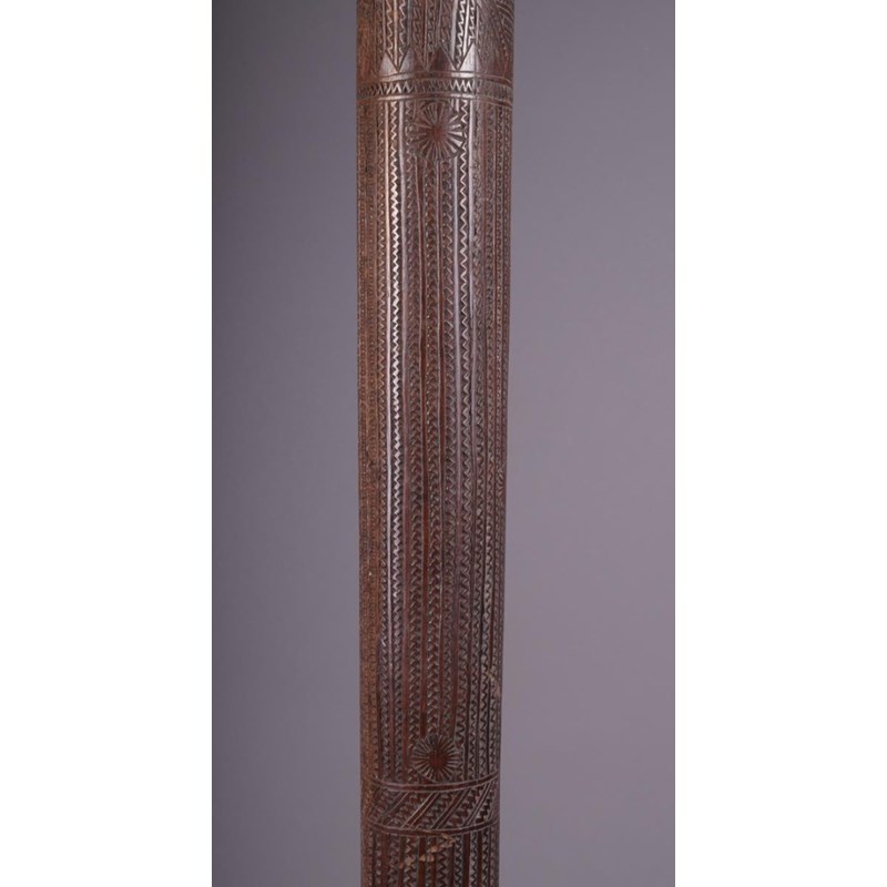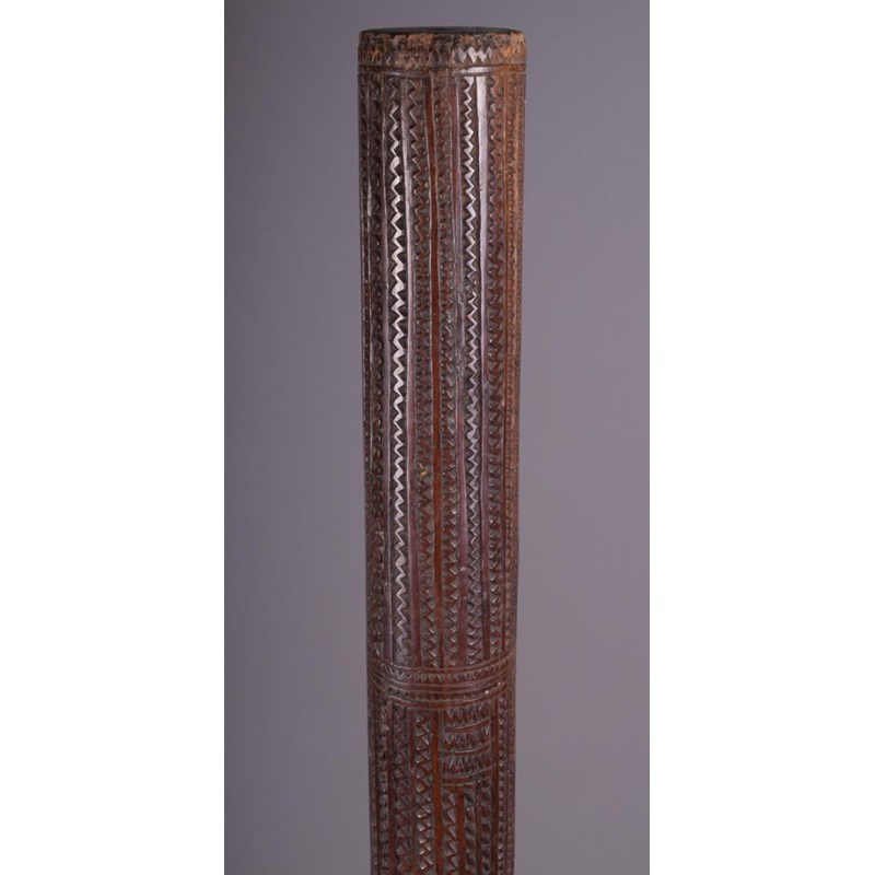 A Tonga pole club, Polynesia, with flat ends and allover zig zig carving and sun symbols, 111cm long.