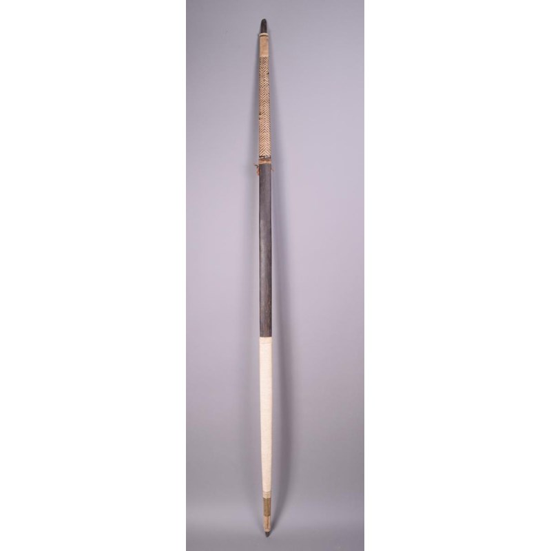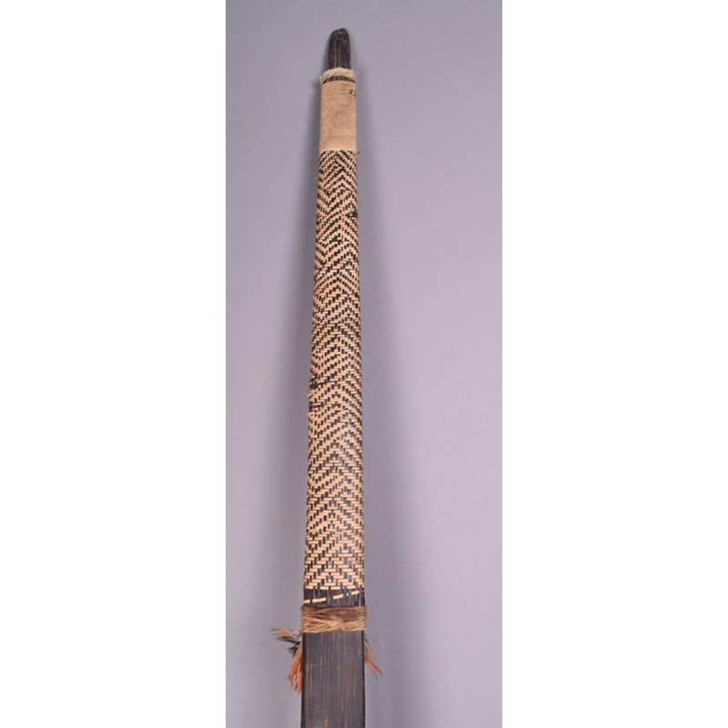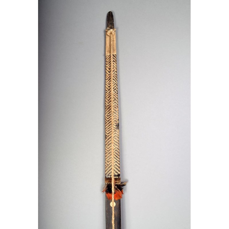 An Amazonian palmwood bow, with woven fibre banding and feathers, 179.5cm long.
