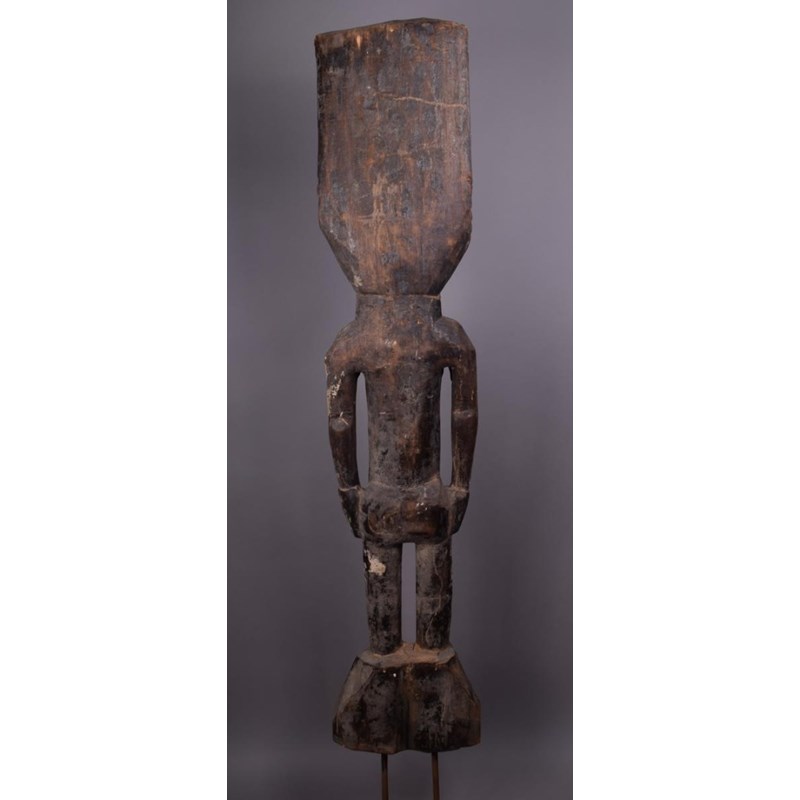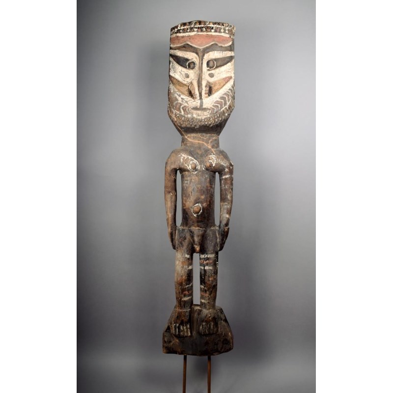 A Sepik River ancestor figure, Papua New Guinea, with pierced nose and pigment decoration, 143cm high, on a stand. (2)