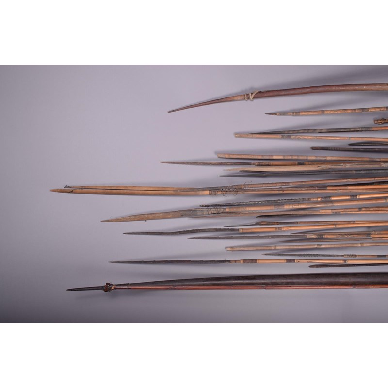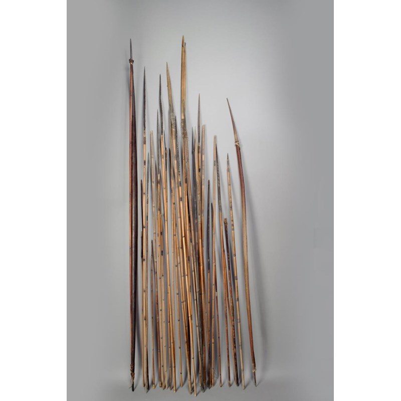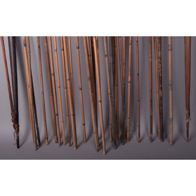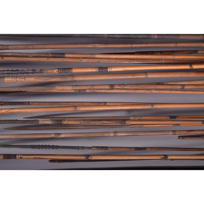 A Papuan palmwood bow, with bound bamboo, 186cm long and a New Hebrides wood bow, the flat side gauged, 159.5cm, and a small collection of bamboo and other arrows, some with engraved decoration. (Qty)