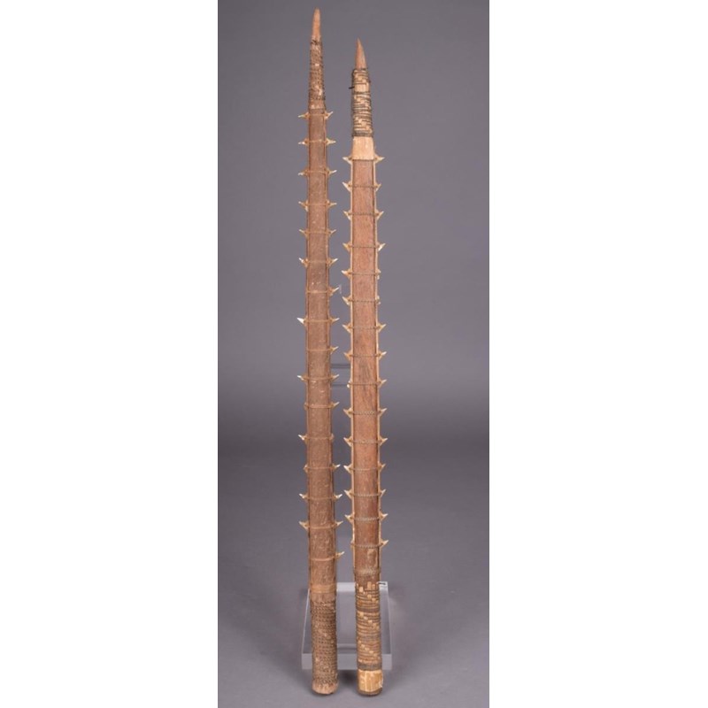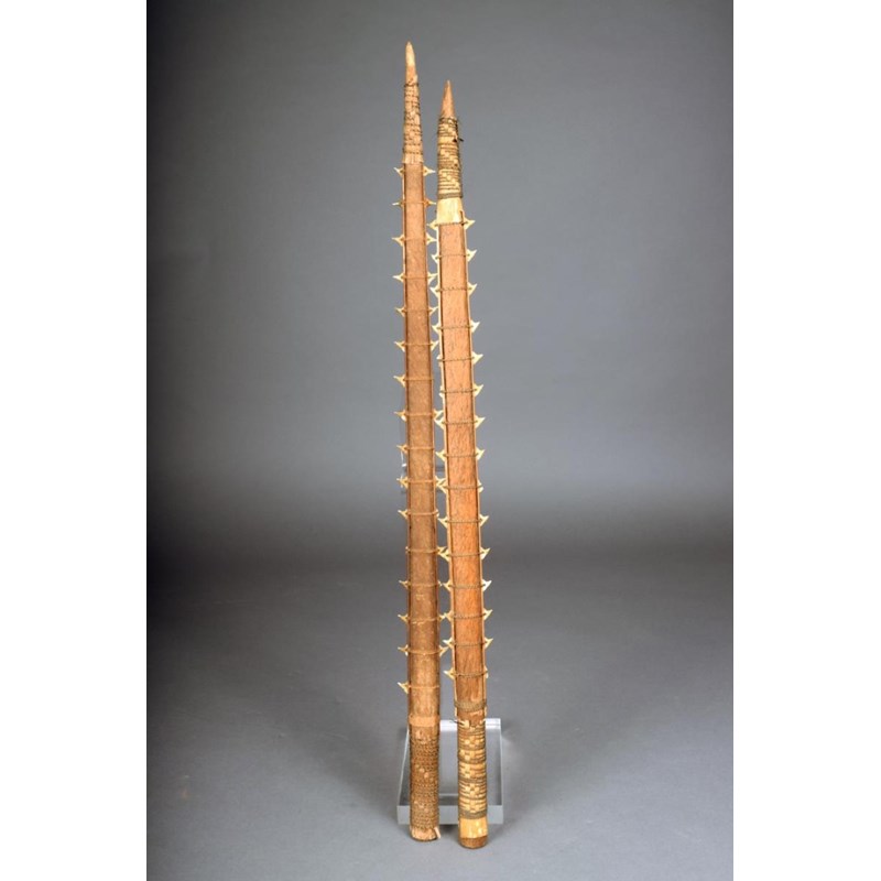 Two Gilbert Islands shark tooth swords, palm wood with fibre binding, 65.5cm and 68.5cm long. (2)