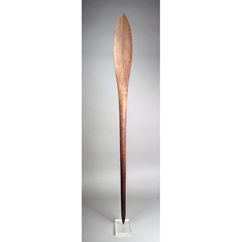 A Solomon Islands paddle club, Melanesia, with a leaf shape blade having medial ridges, with a tapering shaft and faceted point terminal, 133.5cm long.