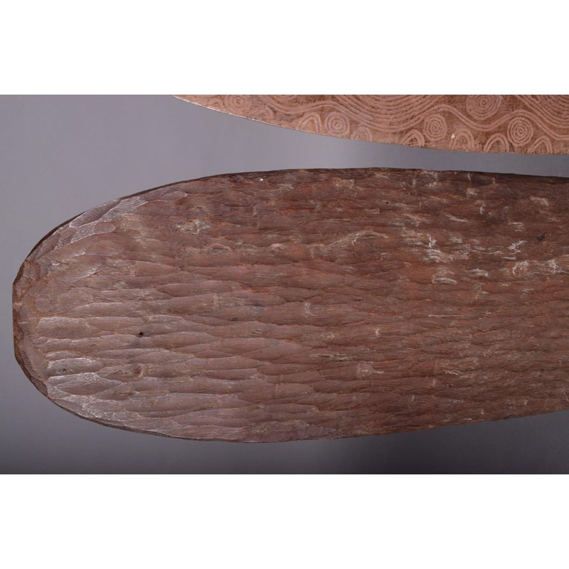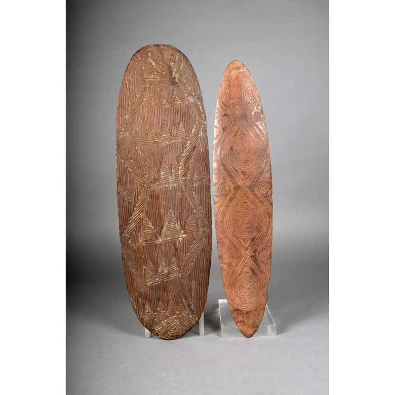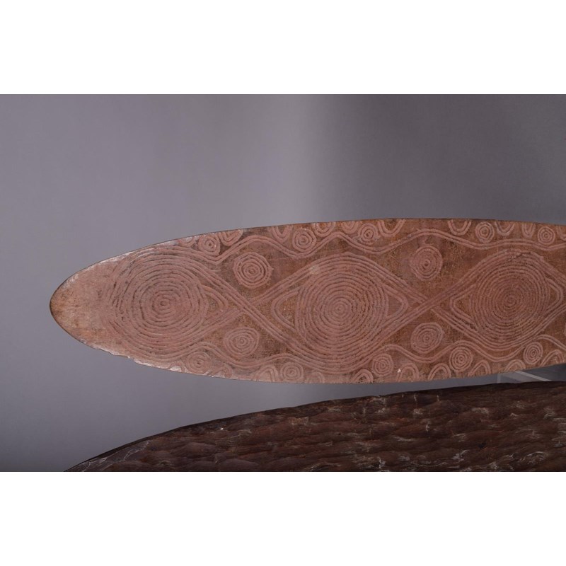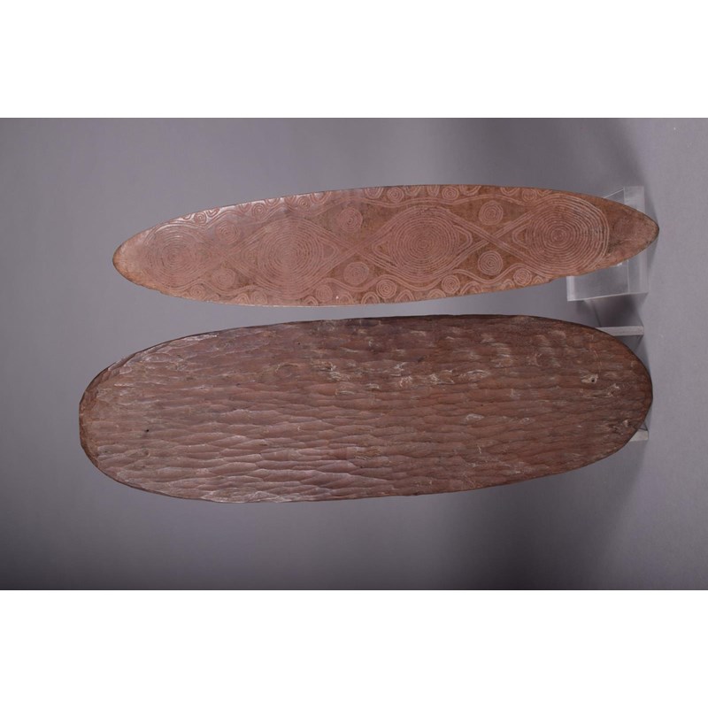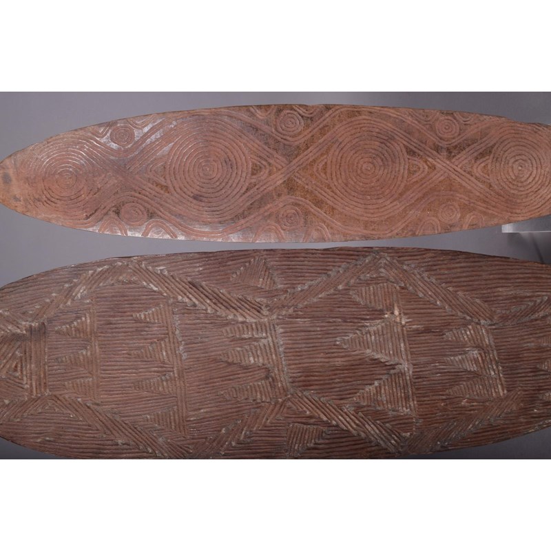 An Aboriginal churinga, of eliptical form, with incised circles, arches and lines to both sides, with remains of ochre, 48.5cm long, and an Aboriginal churinga, oblong with incised linear decoration, the reverse with a textured finish, 52cm long. (2)