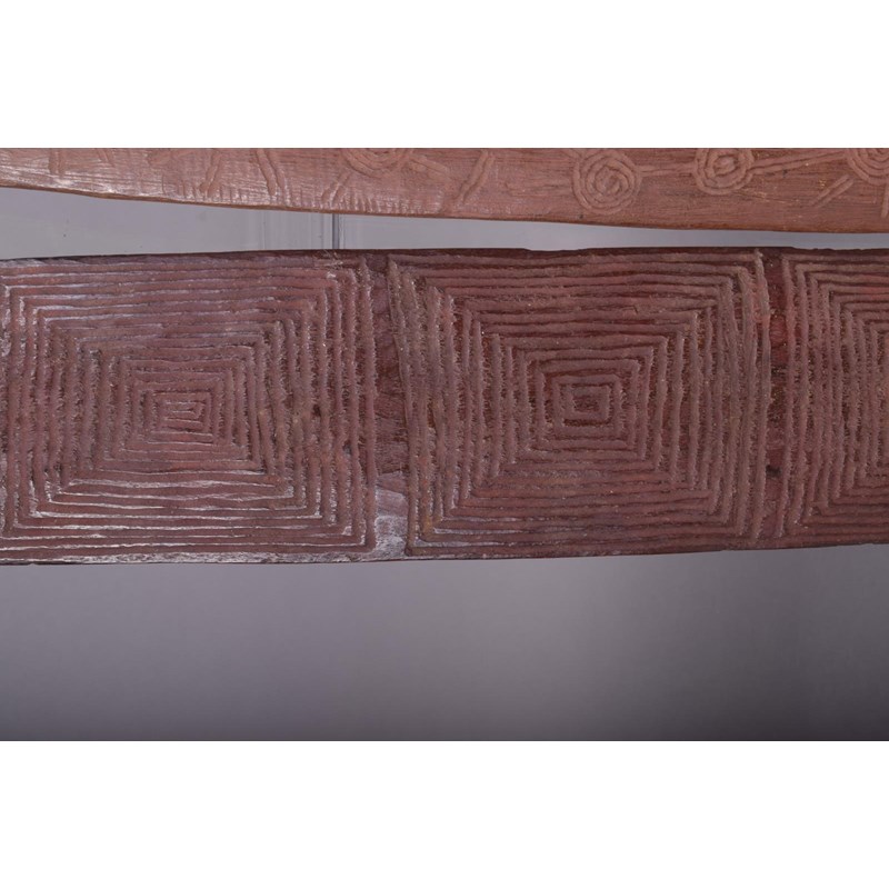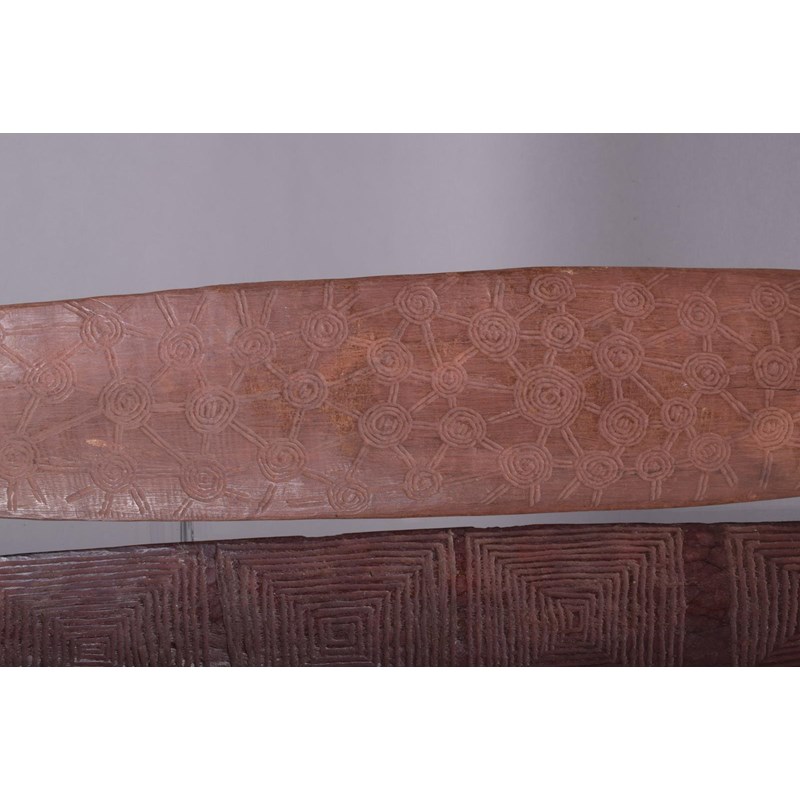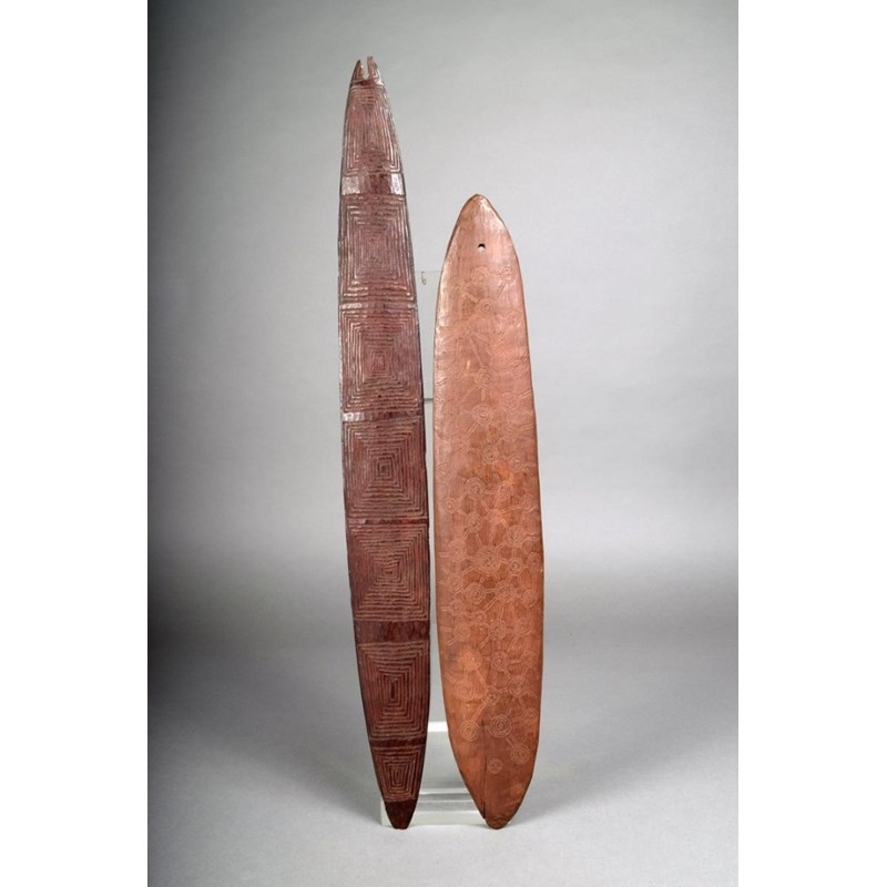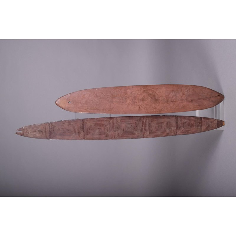 An Aboriginal bullroarer, the flat side incised circles, the domed reverse with linear linked circles, one end pierced, 46.5cm long, and an Aboriginal bullroarer with carved radiating squares, one end pierced, 57.5cm long. (2)