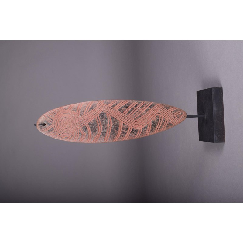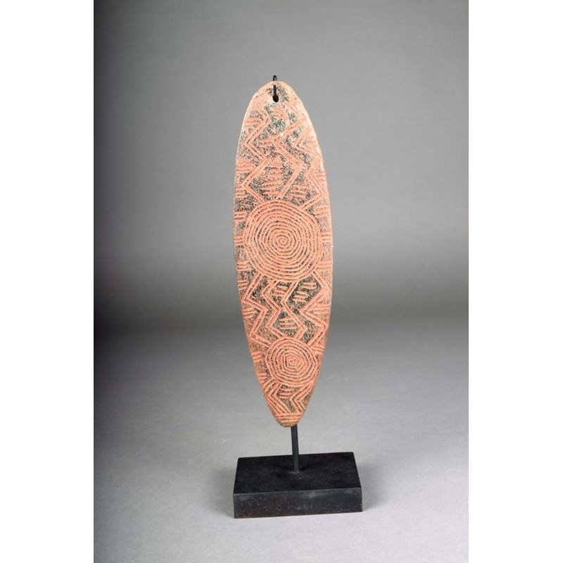 An Aboriginal stone churinga, of eliptical shape with incised two spirals issuing zig-zag and with dashes to one side, the other with a spiral issuing a six line zig-zag and other linear decoration, with ochre pigment, one end pierced, 25.2cm long, on a stand. (2)