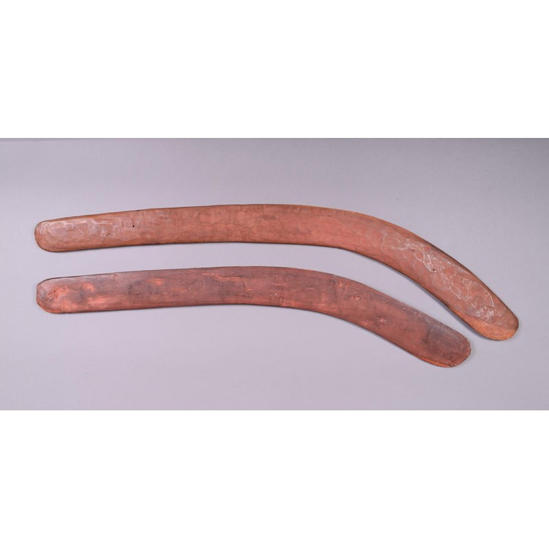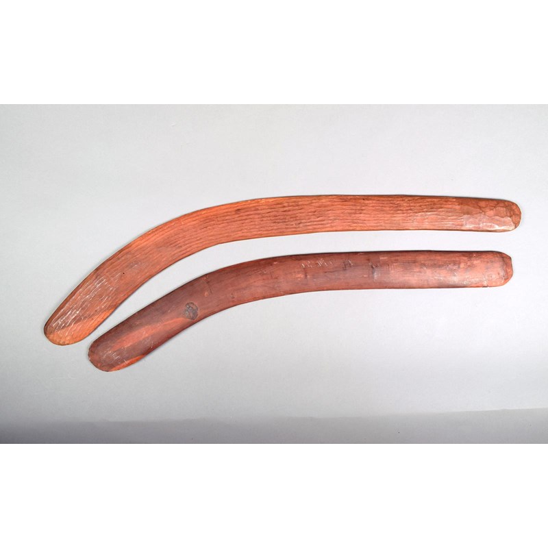 An Aboriginal boomerang, one side with shallow fluting, the grip and back plain, red ochre, 75cm long and an Aborigine boomerang with red ochre finish, 66.5cm long. (2)