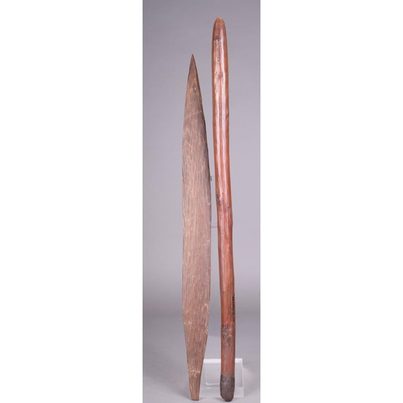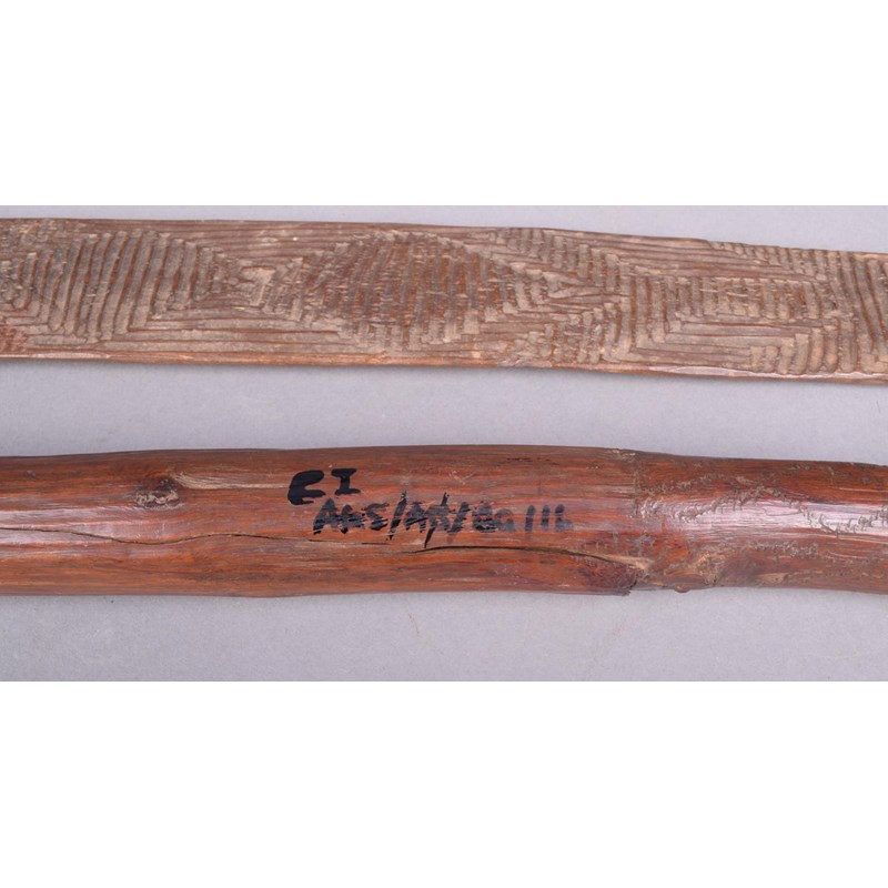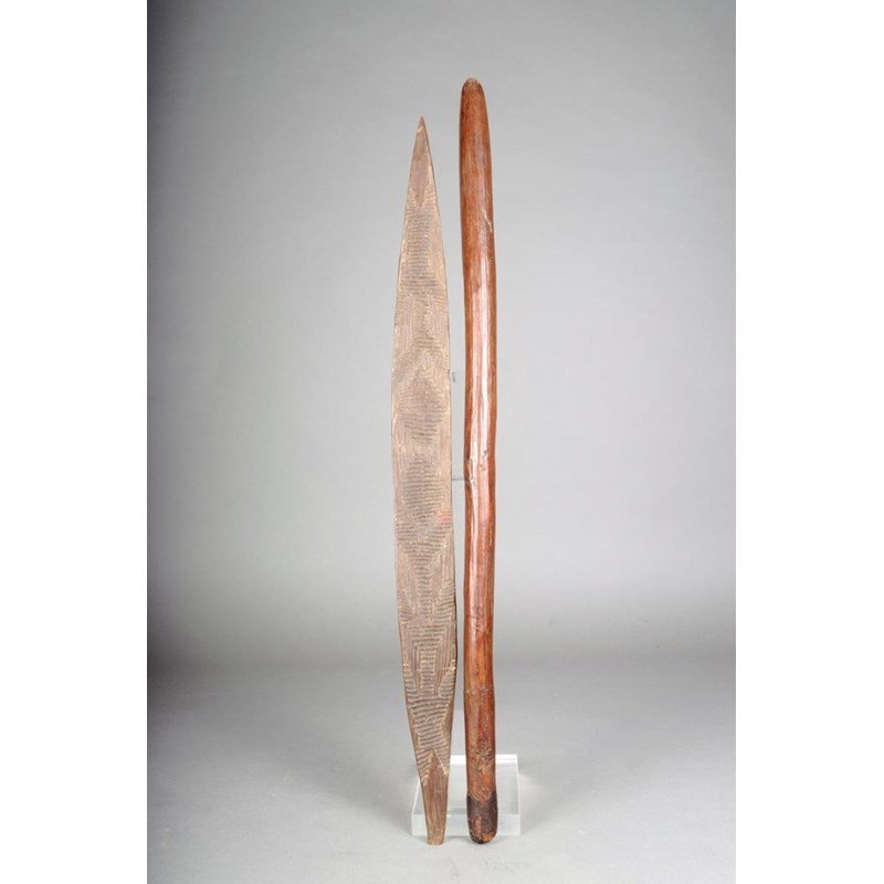 An Aboriginal Churinga, Western Desert, with carved linear decoration, 65cm long and an Aboriginal digging stick, Central Desert, with fine grooves and decorated handle with gum tip, 69cm long. (2)