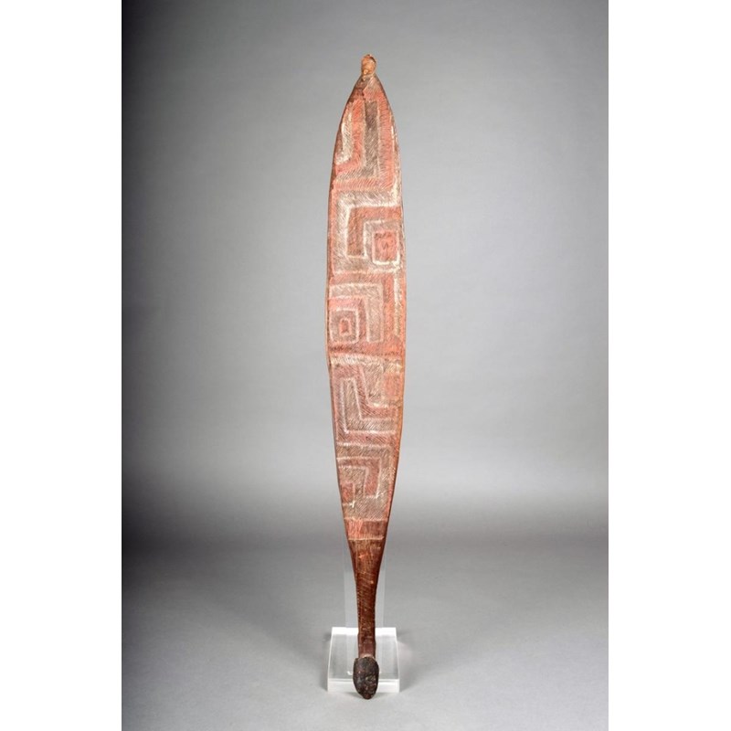 An Aboriginal woomera, spear thrower, with incised linear decoration, with ochre and white pigment, with fibre bound point and gum covered handle, 84.5cm long.