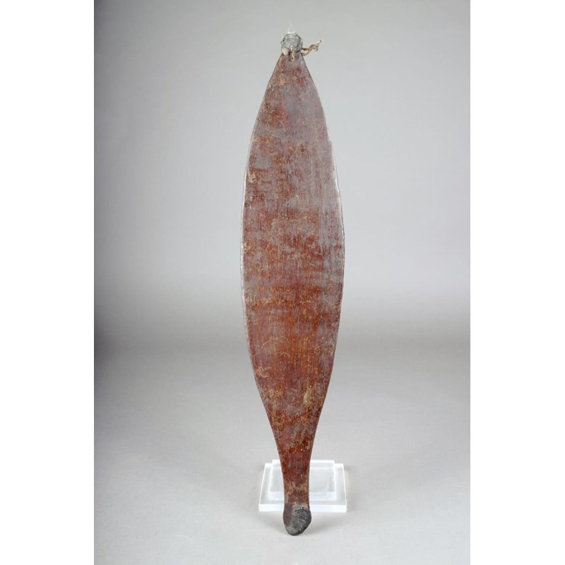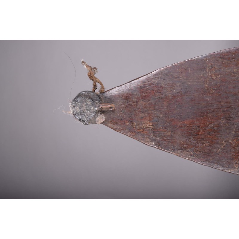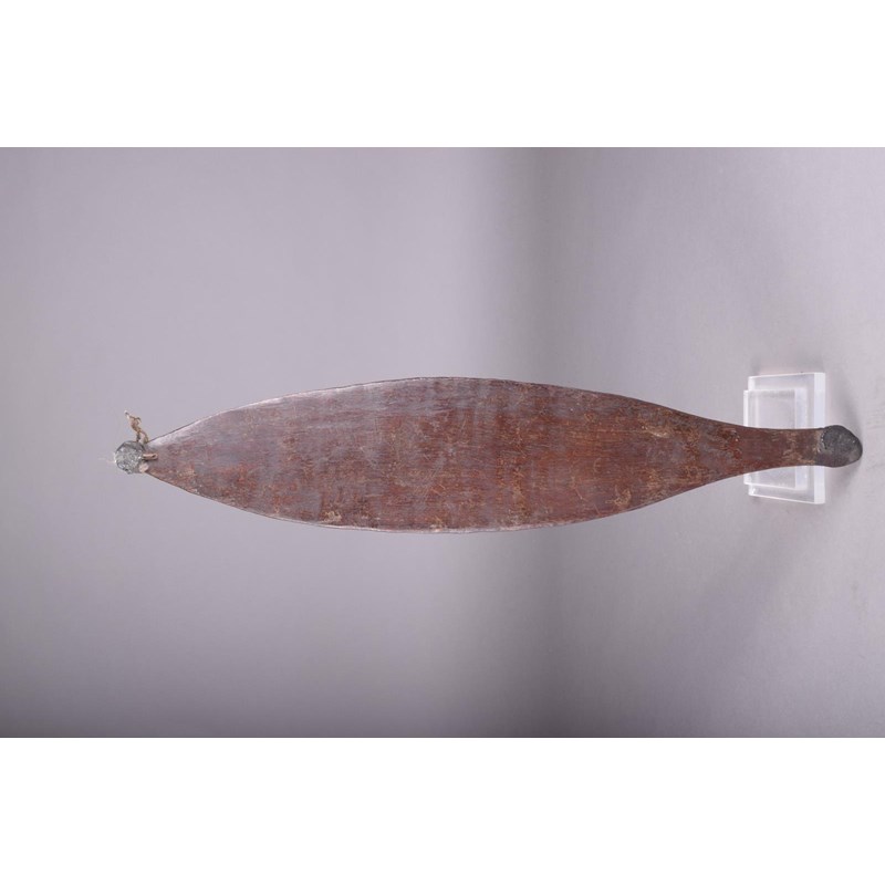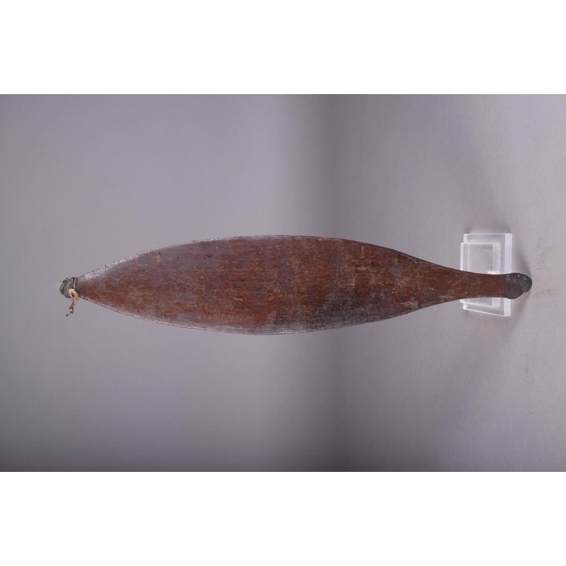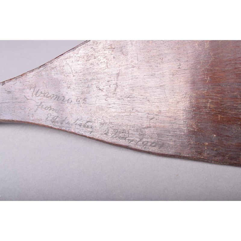 An Aboriginal woomera, spear thrower, with remains of gum to each end and with point, one side inscribed Wamro from E.J. Lafraby July 1901, 52.3cm long.