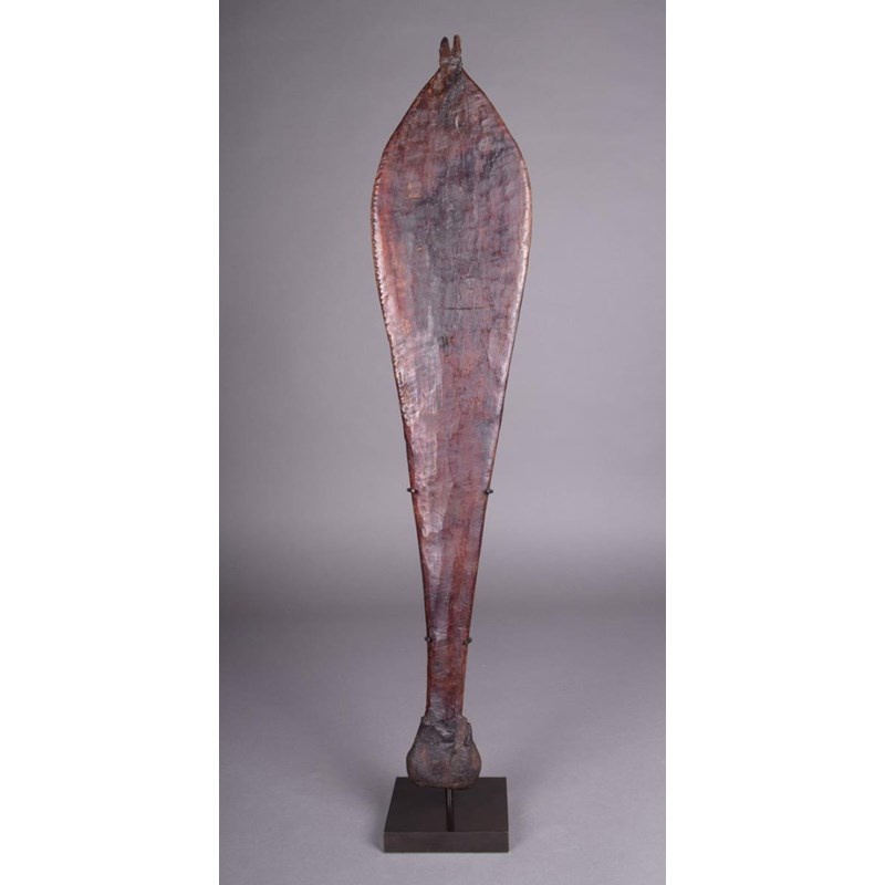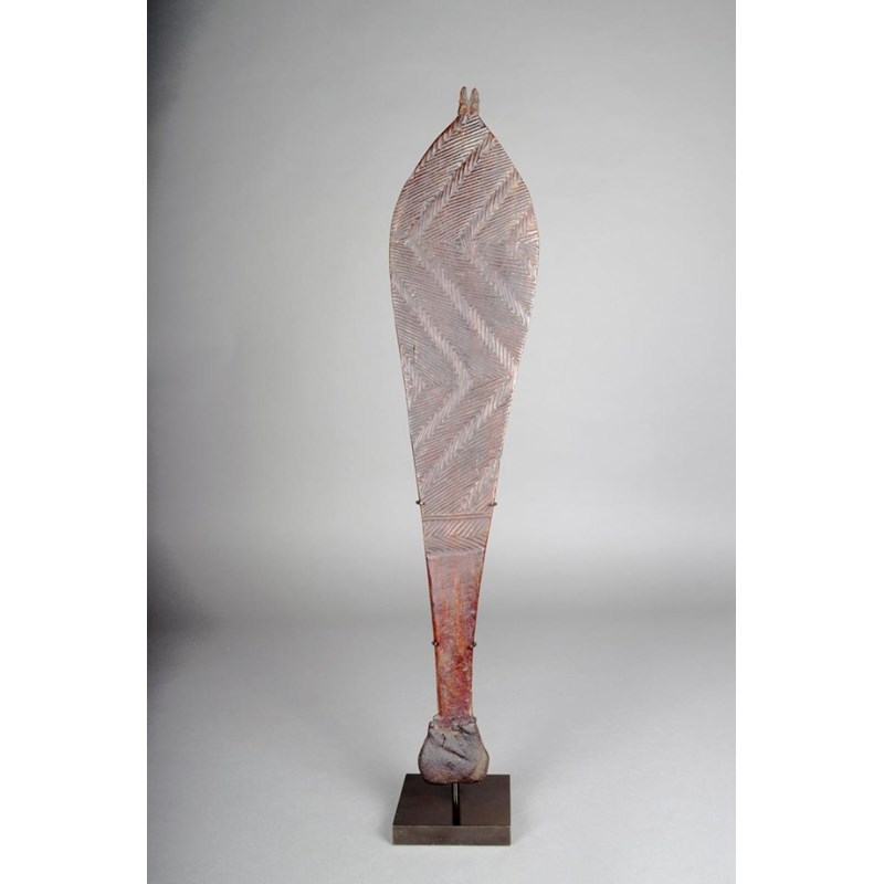 An Aboriginal spear thrower, wood with carved linear decoration and gum to the handle, one outside edge with notches, 60.5cm long, on a stand. (2)