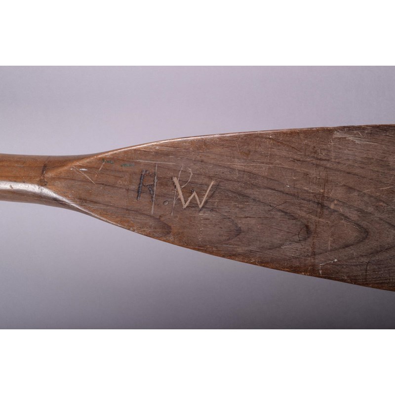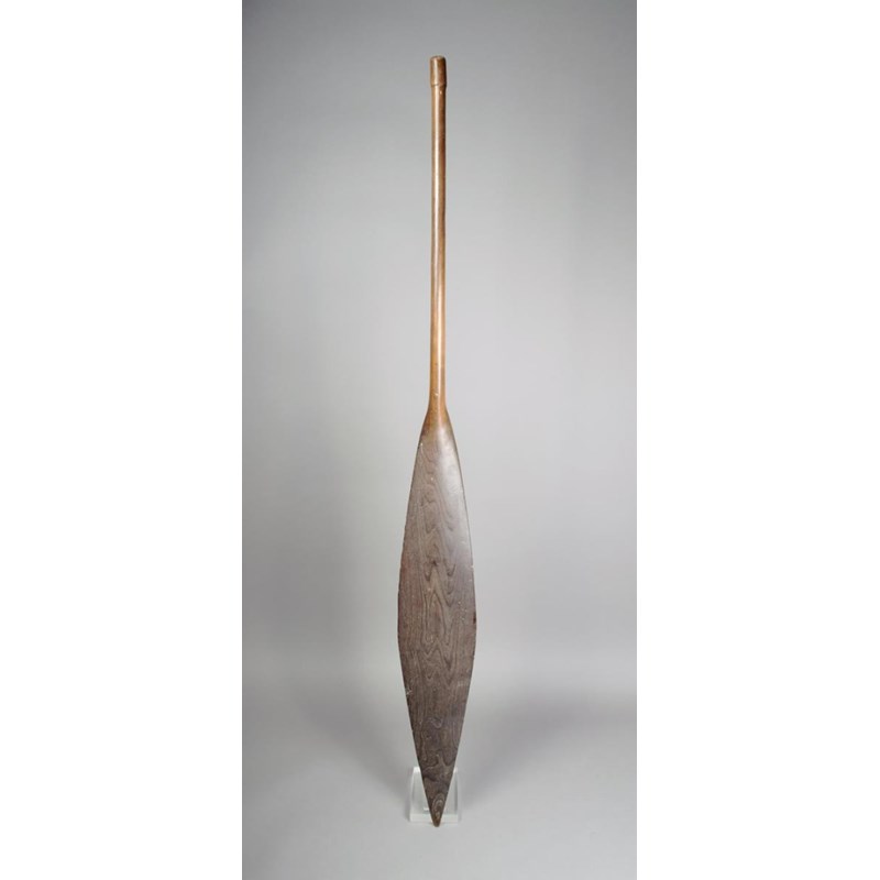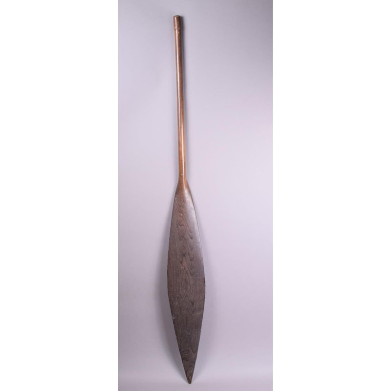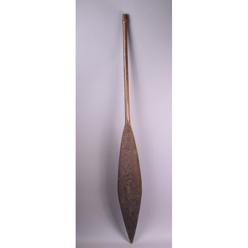 A Maori hoe, paddle, with a flat blade incised initials RW over TP, with a knopped handle, 144cm long.