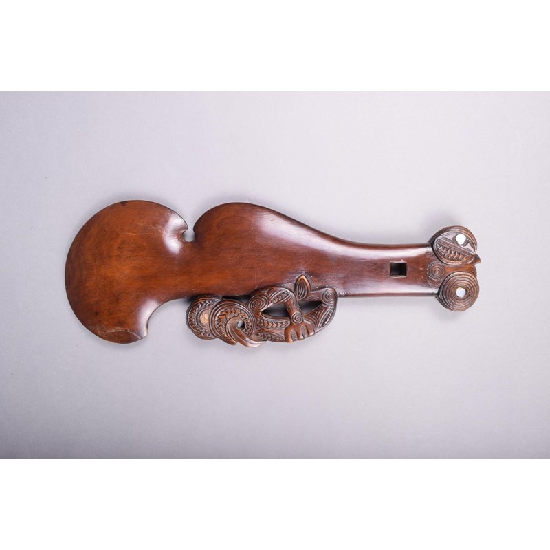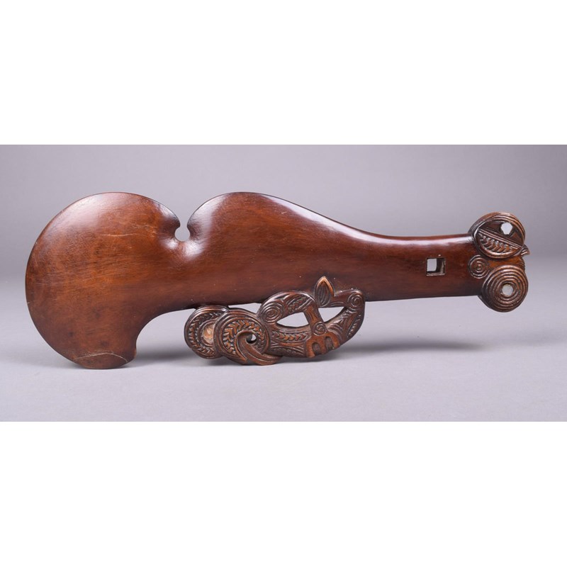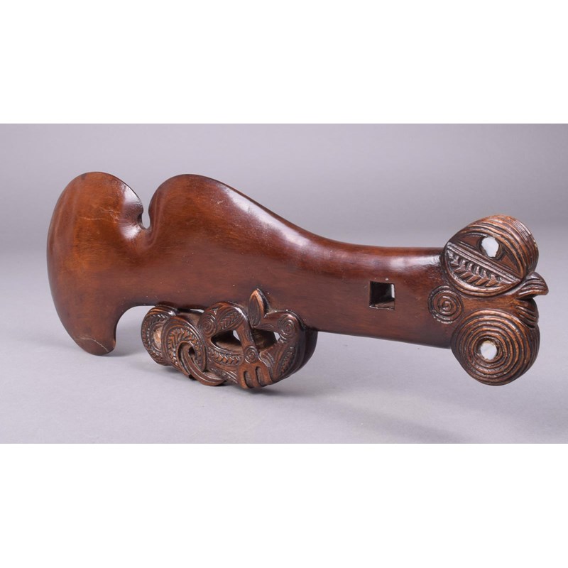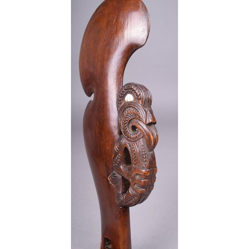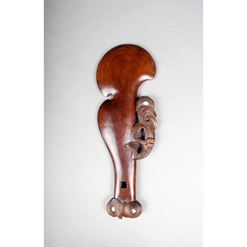 A Maori hand club, wahaika, carved with a tiki with inlaid shell eyes, with a shaped blade, the handle with a square aperture and tiki mask terminal, 30cm long.