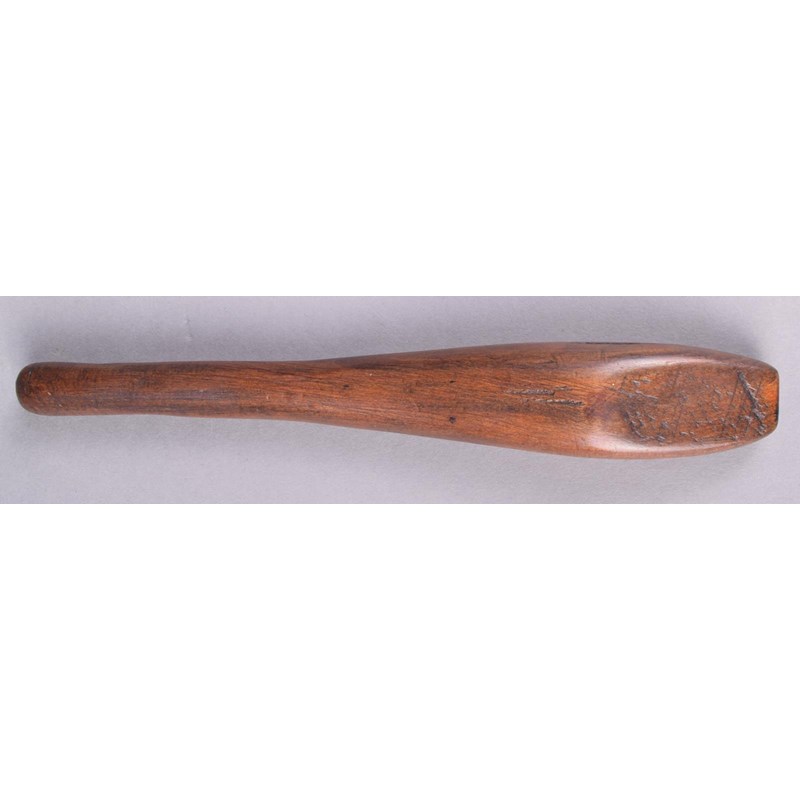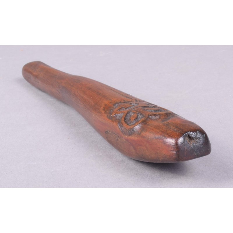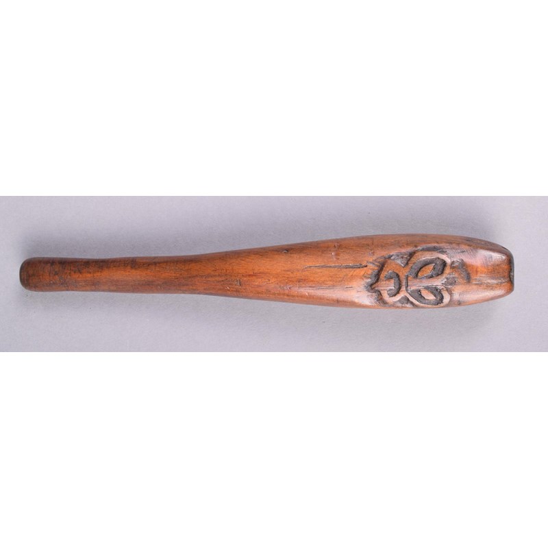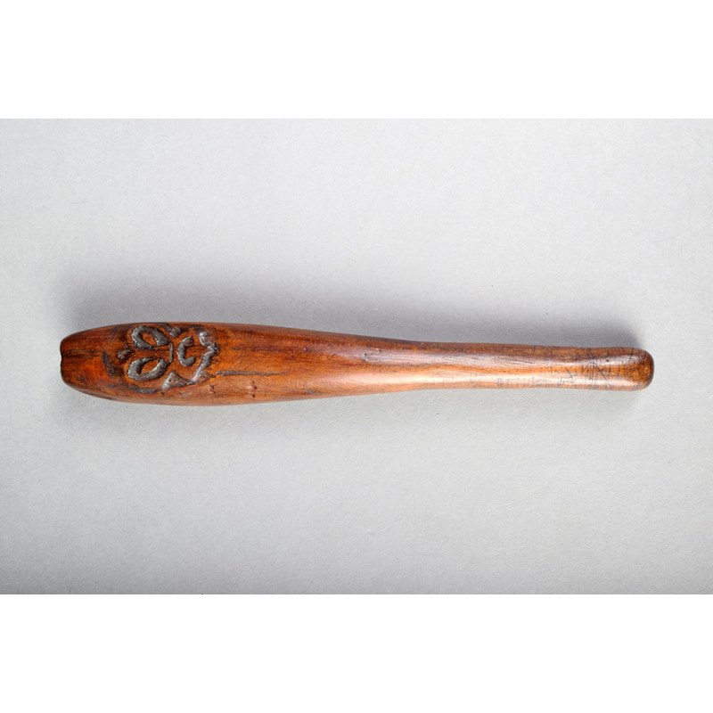 A Maori wood implement, carved with a tiki mask, with a flattened surface, 16.5cm long.