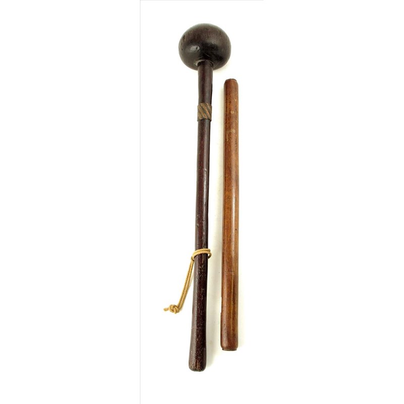 A South African knobkerrie, with an interlaced copper band, 23in (58.4cm) long, and a hardwood baton, 18¼in (46cm) long. (2)