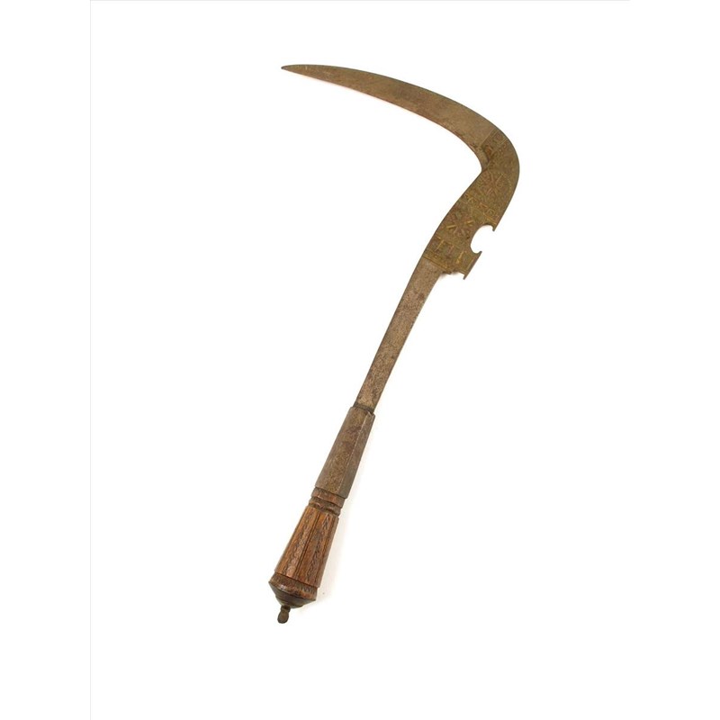 An African ceremonial knife, with a curved steel blade and applied a brass sheet with geometric designs and with a wooden handle, 17¼in (43.6cm) long.