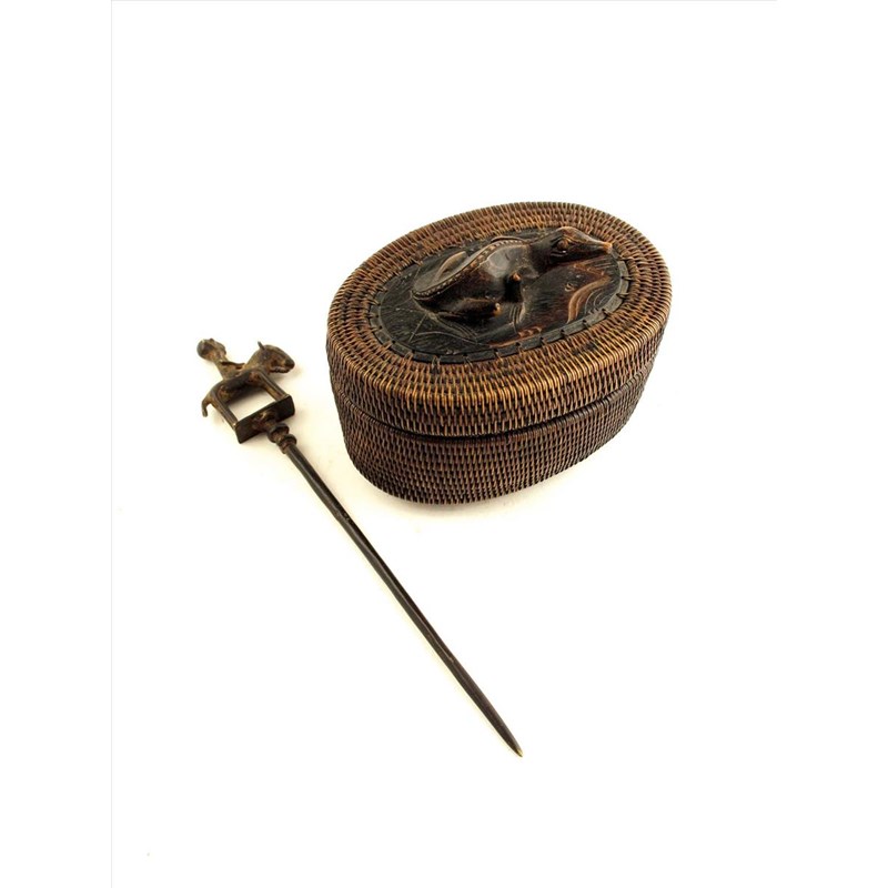 An African woven basket and cover, possibly Barotse, Zambia, with a lizard handle, 4in (10cm) high, 6in (15cm) wide, together with a Fon bronze staff, Nigeria, the finial formed as a man riding a horse, 10½in (26.3cm) high. (2)