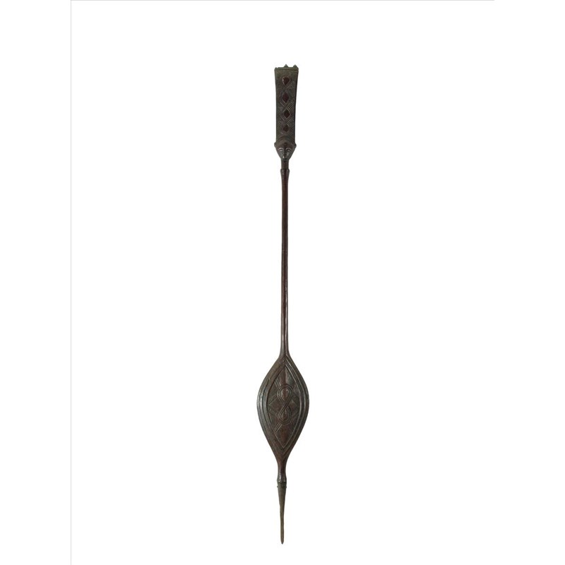 A Luba staff of office, with a Janus head finial with a slightly flared panel above carved with an interlaced motif and angled ribbed panel, with metal finials, one missing, the base with an eliptical panel with stepped borders and further carved designs, with a metal tip, 60¼in (153cm) high.