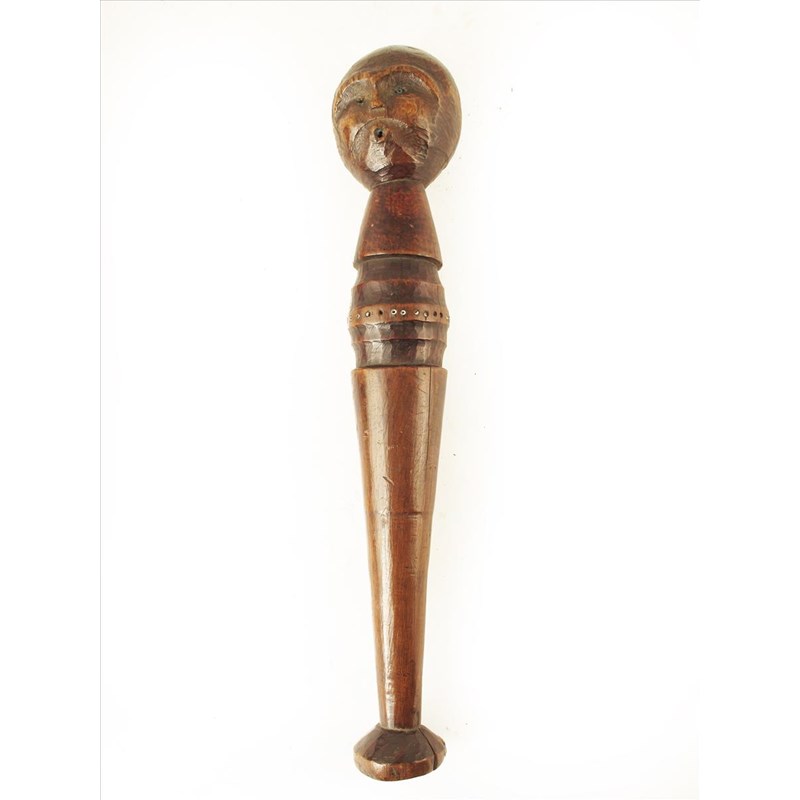 An East African carved wood club, with a mask finial and tapering handle with inlaid beads, with a circular pestle base, 14½in (37cm) high.