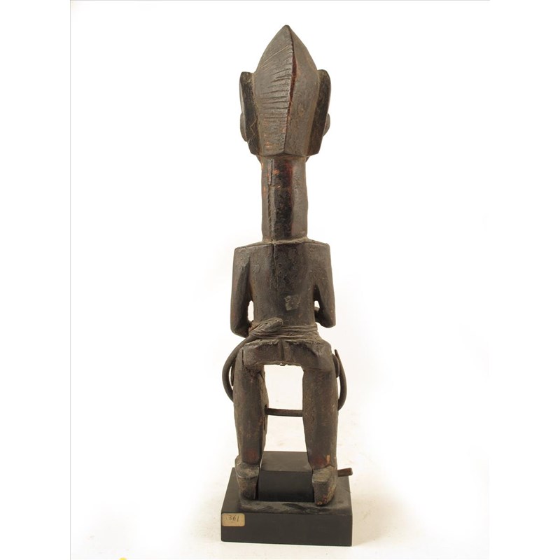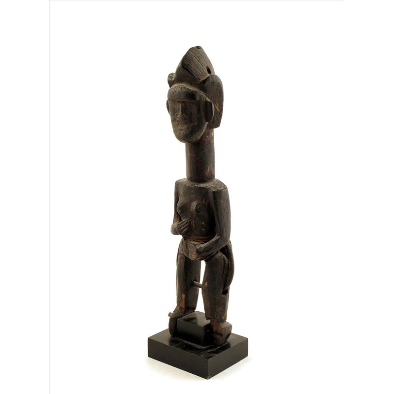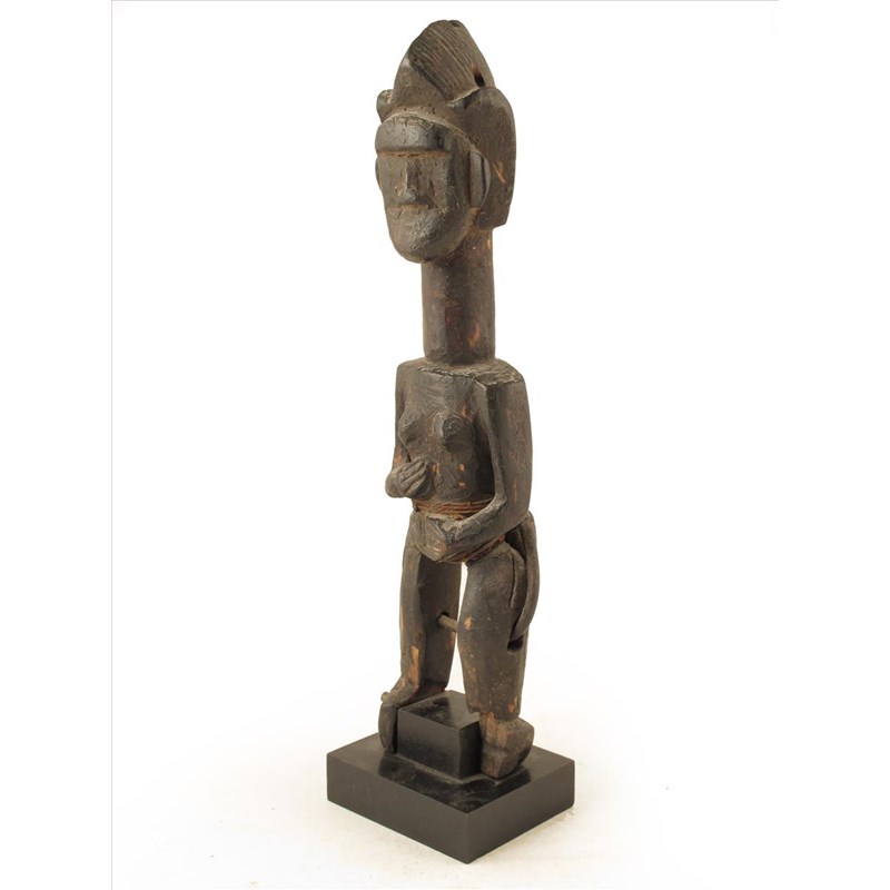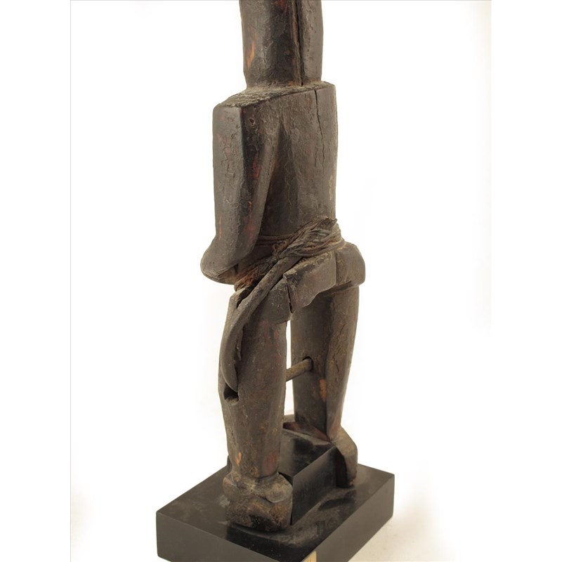 A heddle pulley, possibly Dan, carved as a standing female figure with a crested coiffure, one side with incised line decoration, with a long neck and with both hands on the abdomen, the legs with an old 'native' repair, white inventory number 277, 13in (33cm) high, on a later stand.