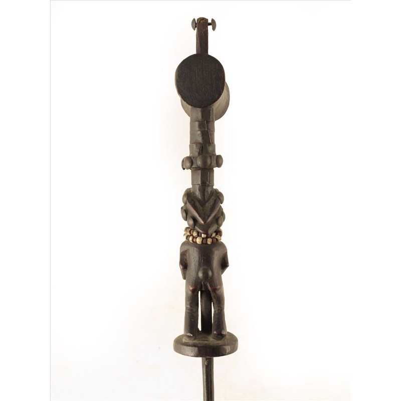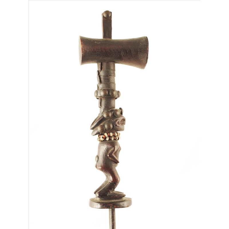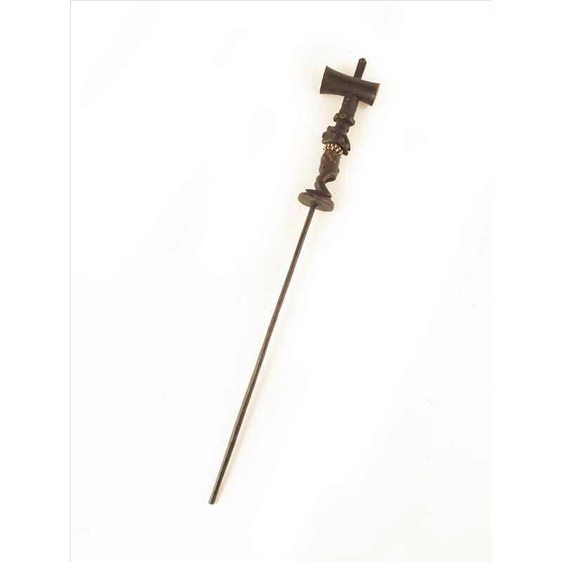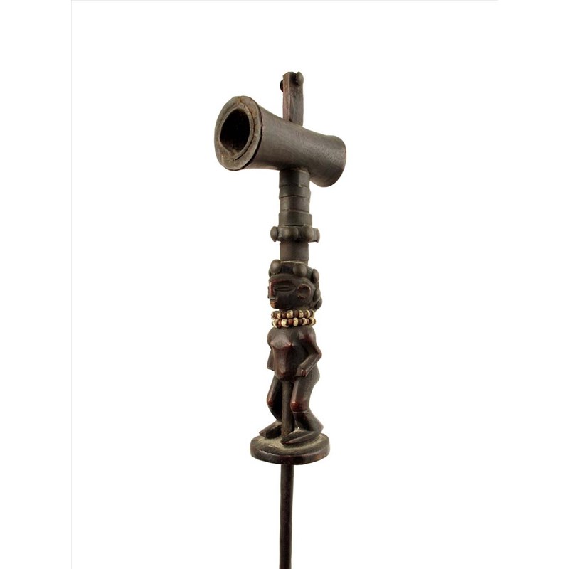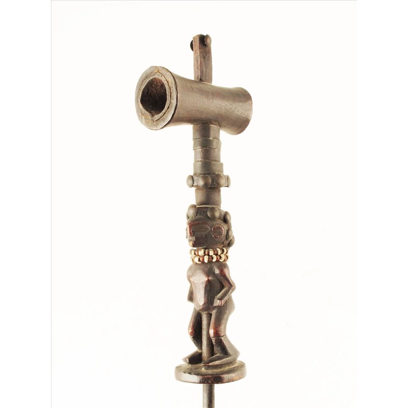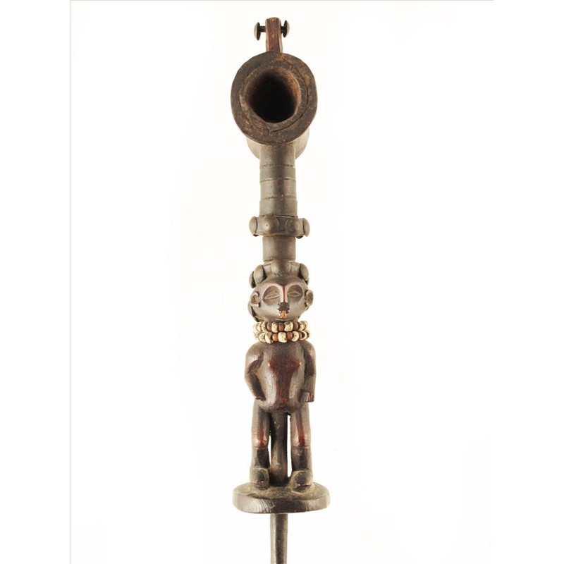 A Ovimbundu wood pipe, of a standing figure with a pointed back coiffure, with a bead necklace above metal bands and studs, with a waisted cylindrical bowl, with a folded metal shaft, white inventory number 6, 20¾in (52.8cm) long.