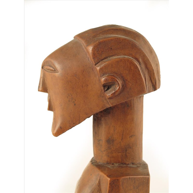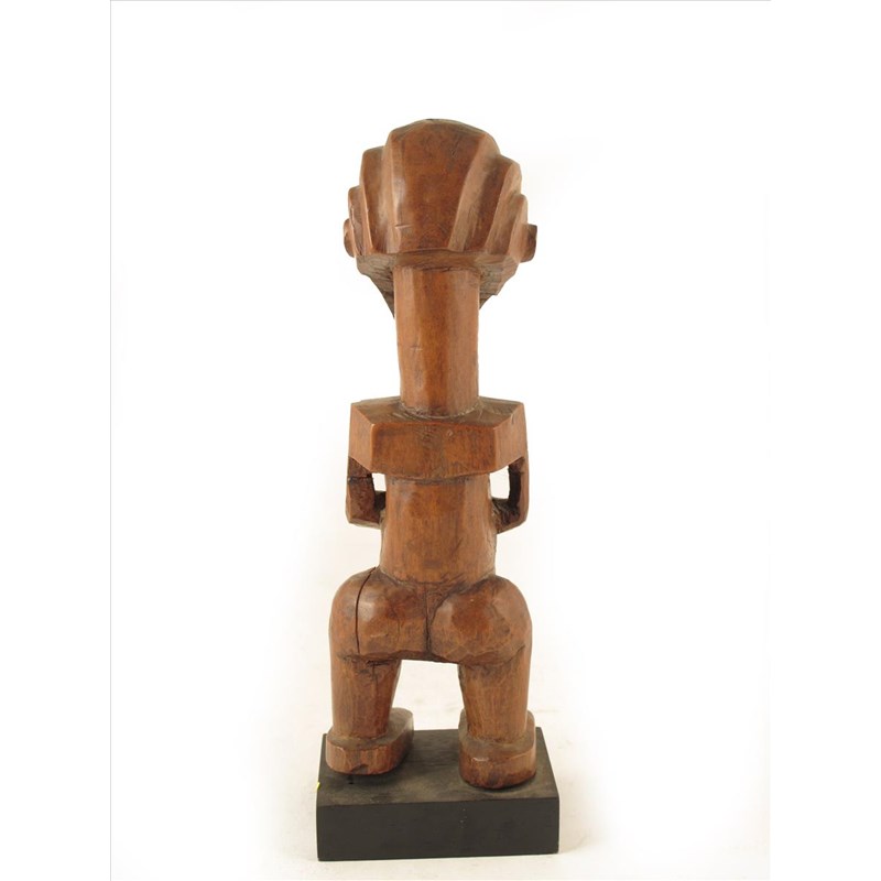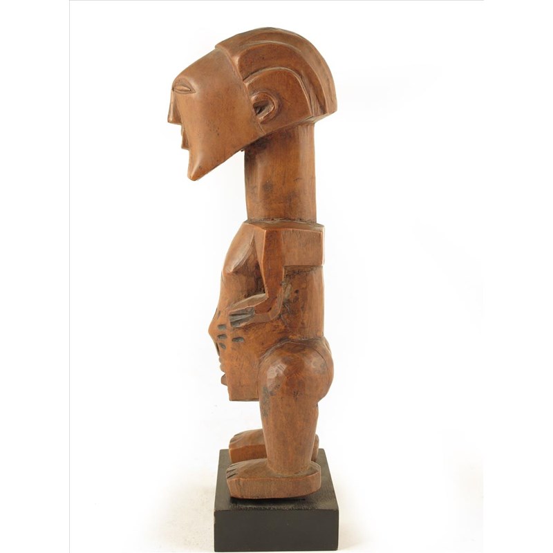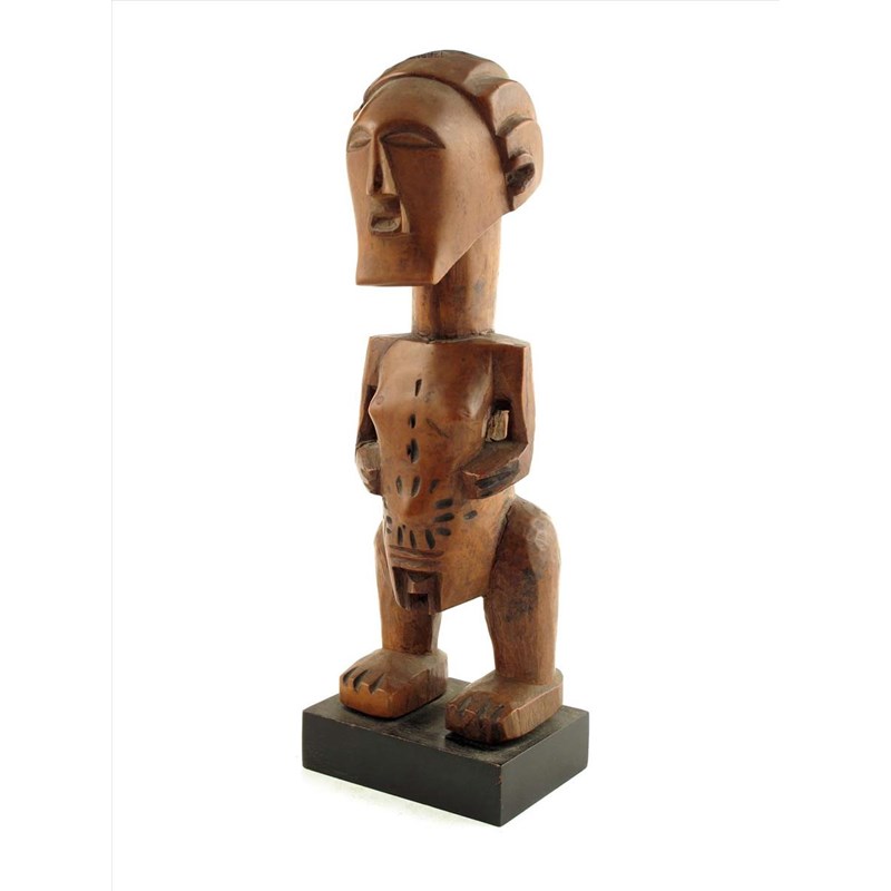 A Songye fetish figure, with a stepped coiffure and previously with an inset horn, with a square chin and scarifications to the body, white inventory number 29, 11in (28cm) high, on a later stand.
