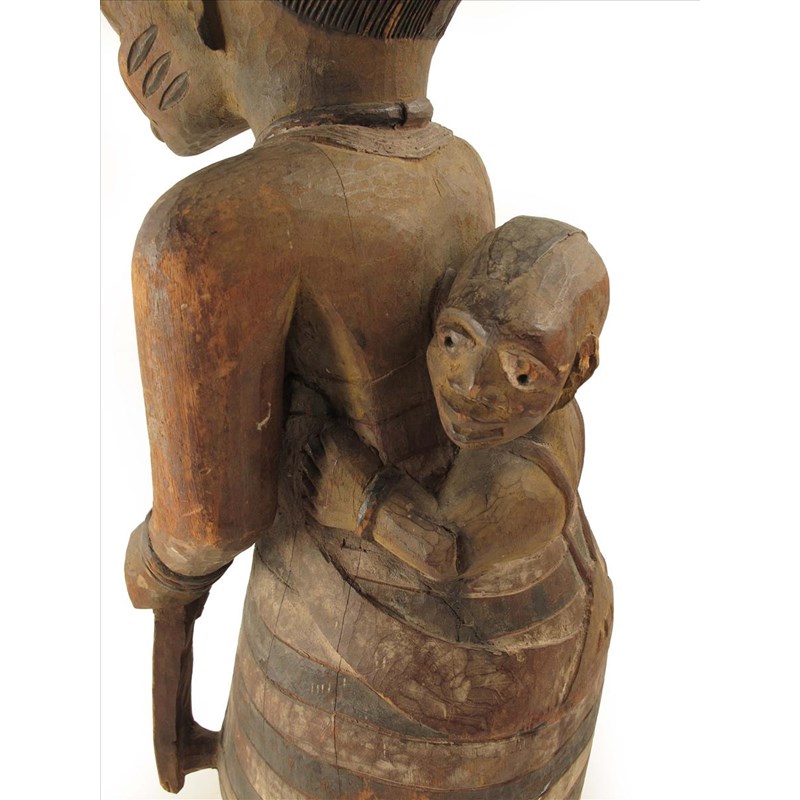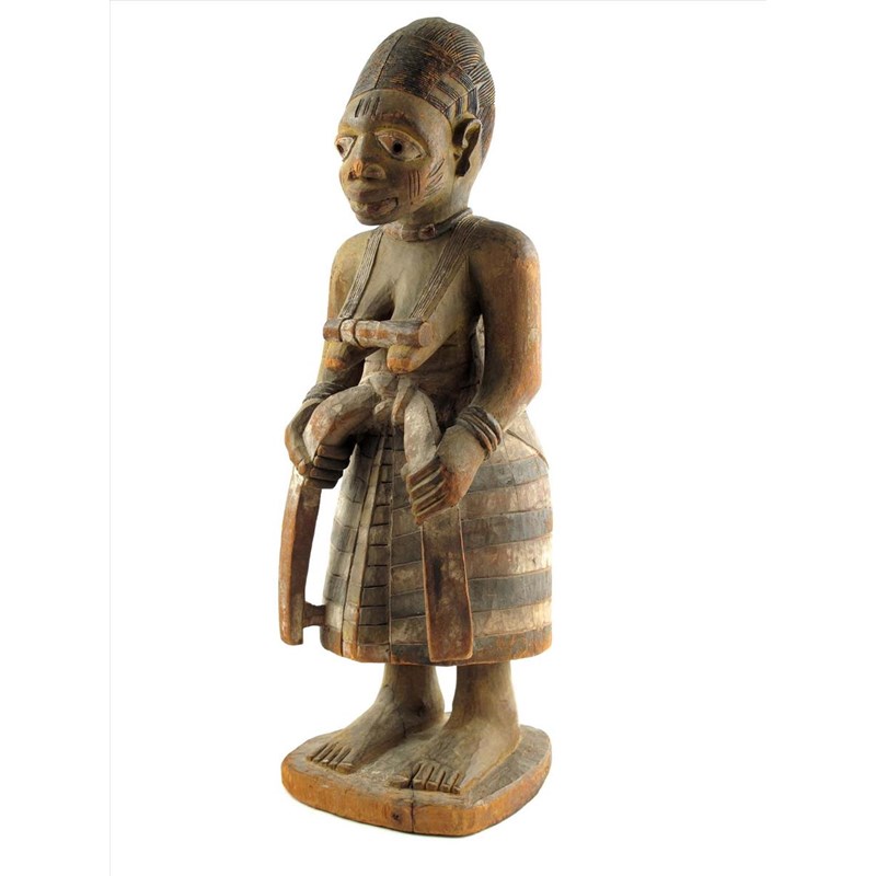 A Yoruba carved wood standing female figure with child, part ebonised with white pigment, with stylised coiffure with clasp to reverse, with a bar strap supported on her breasts and with a knotted sash around her waist with her hands palm and knuckle side on, her child with a single flat crest coiffure and with a strapped triangular pendant, with bead necklace (loose), with inventory number 16, twice and inscribed SEALY, 23in (58.5cm) high.