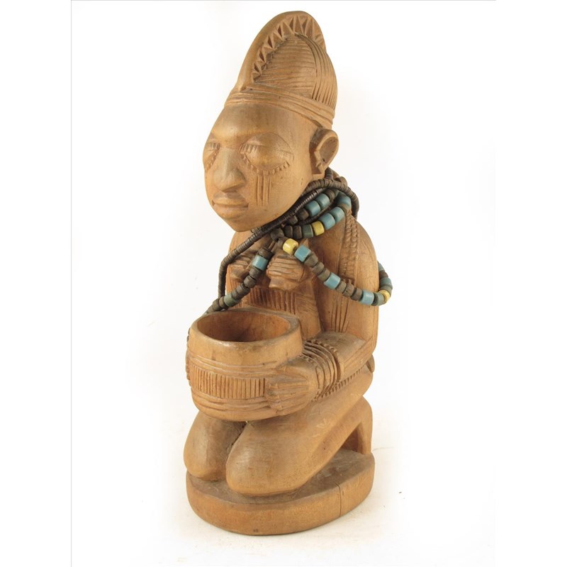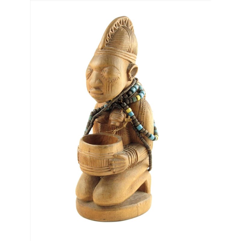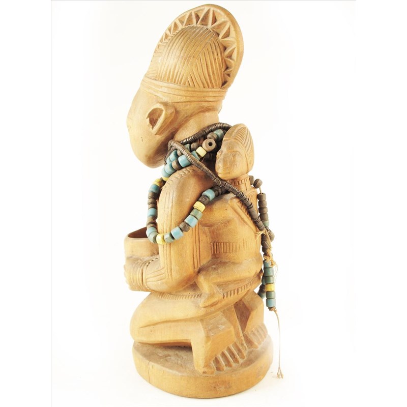 A Yoruba kneeling offering figure, with a child on her back and it's hands on her breasts, with beads, white inventory number 1, 13½in (34.2cm) high.