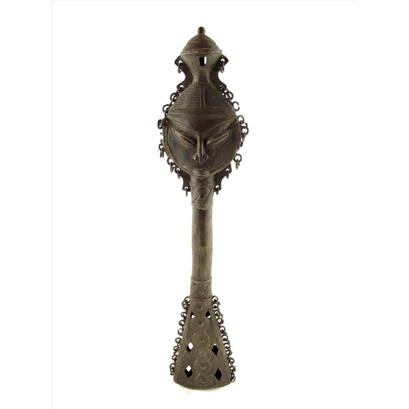 A Yoruba brass rattle staff, the Janus head with fine cable borders and a pierced finial, the central shaft with interlaced bands to a pierced triangular base with similar decoration, the head and base with ringlets for bells, missing, 17½in (44.5cm) high.