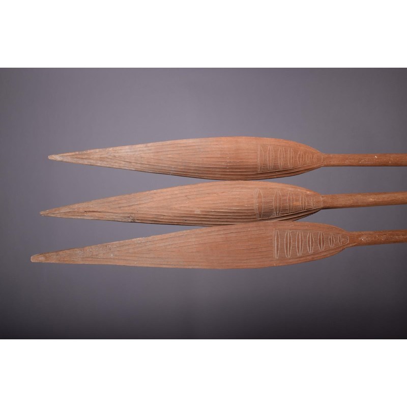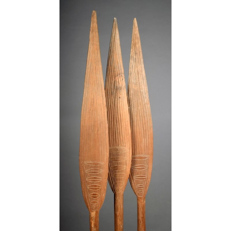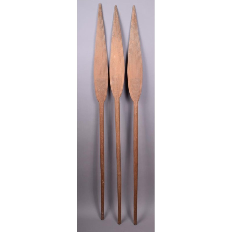 Three Oceanic paddles, with grooved and panelled leaf shape blades with faceted tapering shafts, 139cm long. (3)