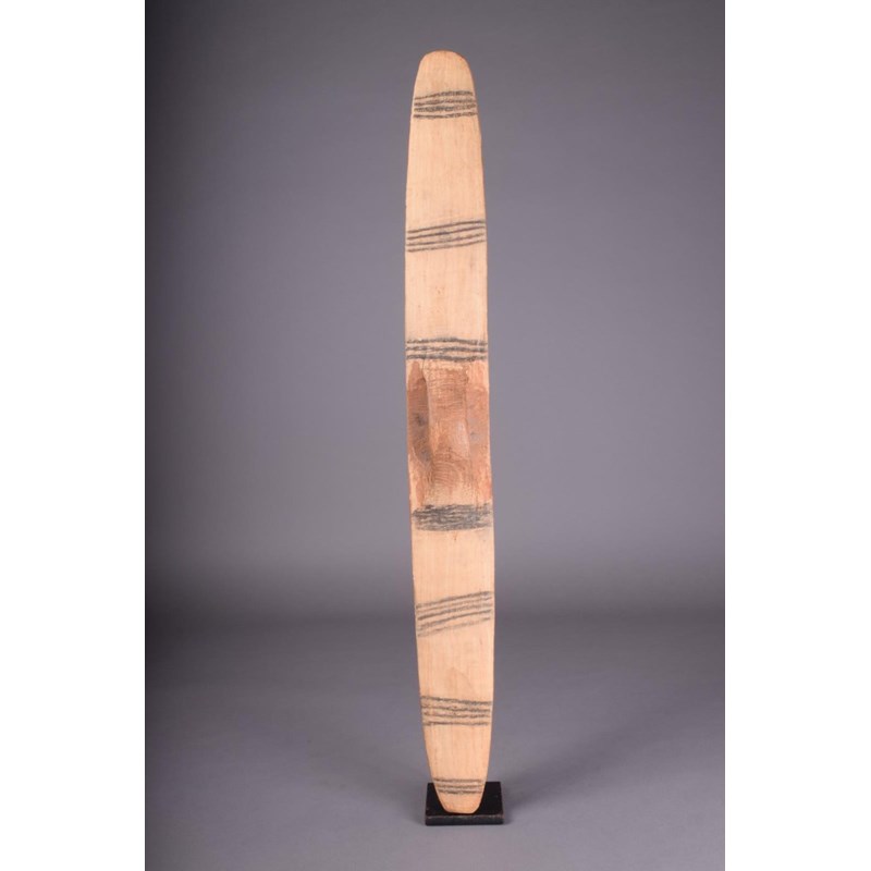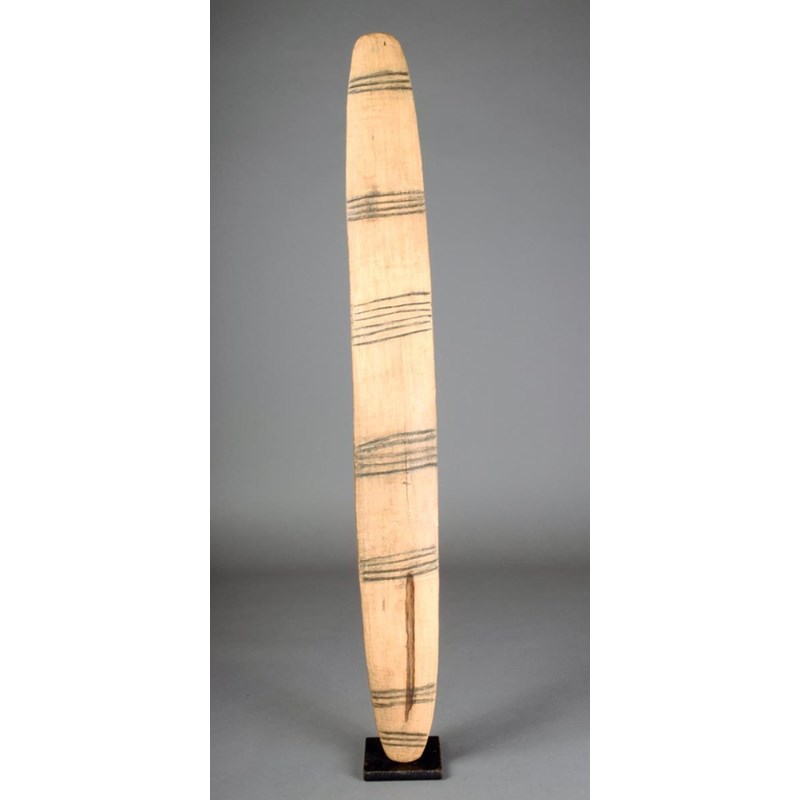 An Aborigine shield, of narrow oblong form with incised horizontal linear decoration with an integral handle, 72cm long.