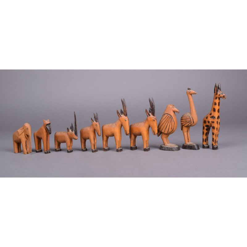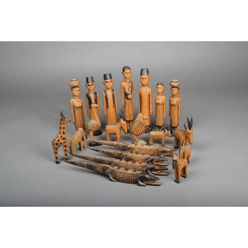 A group of East African carved wood figures and animals
