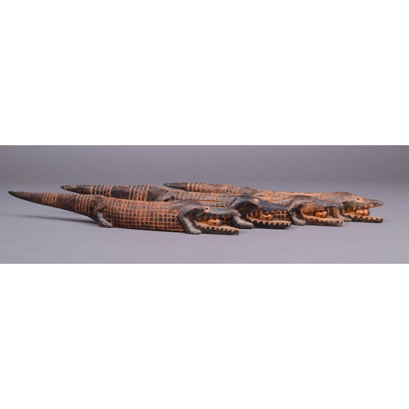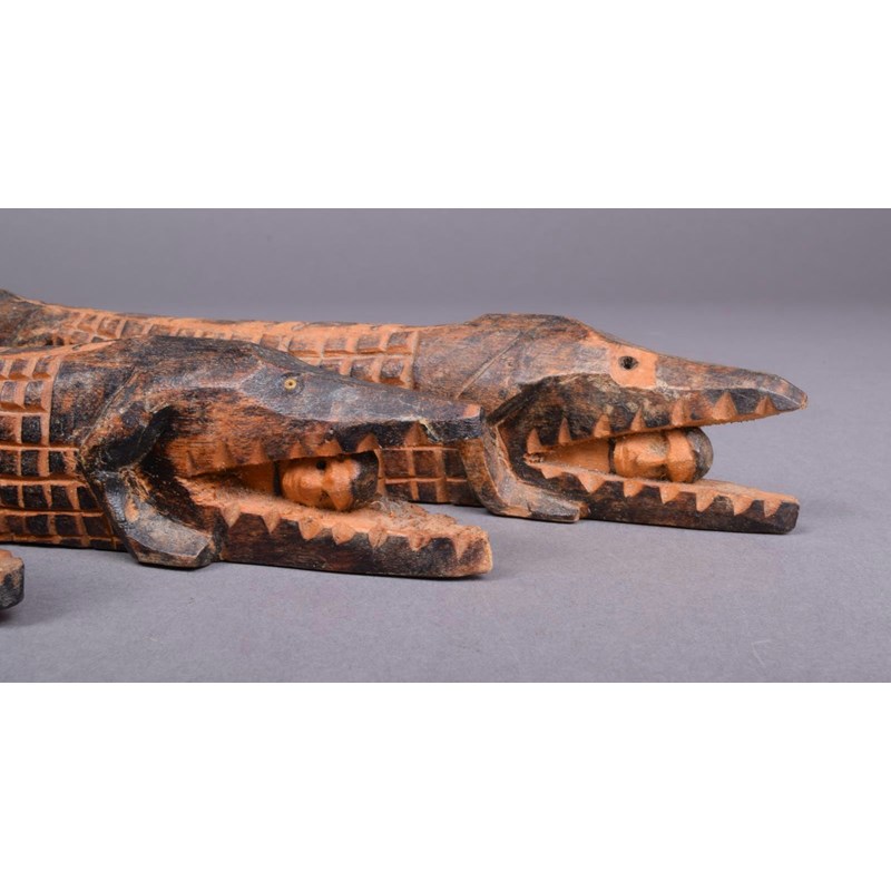A group of East African carved wood figures and animals, the majority with bead eyes, including four crocodiles each with a human in it's jaw, 26.5cm the longest. (20)