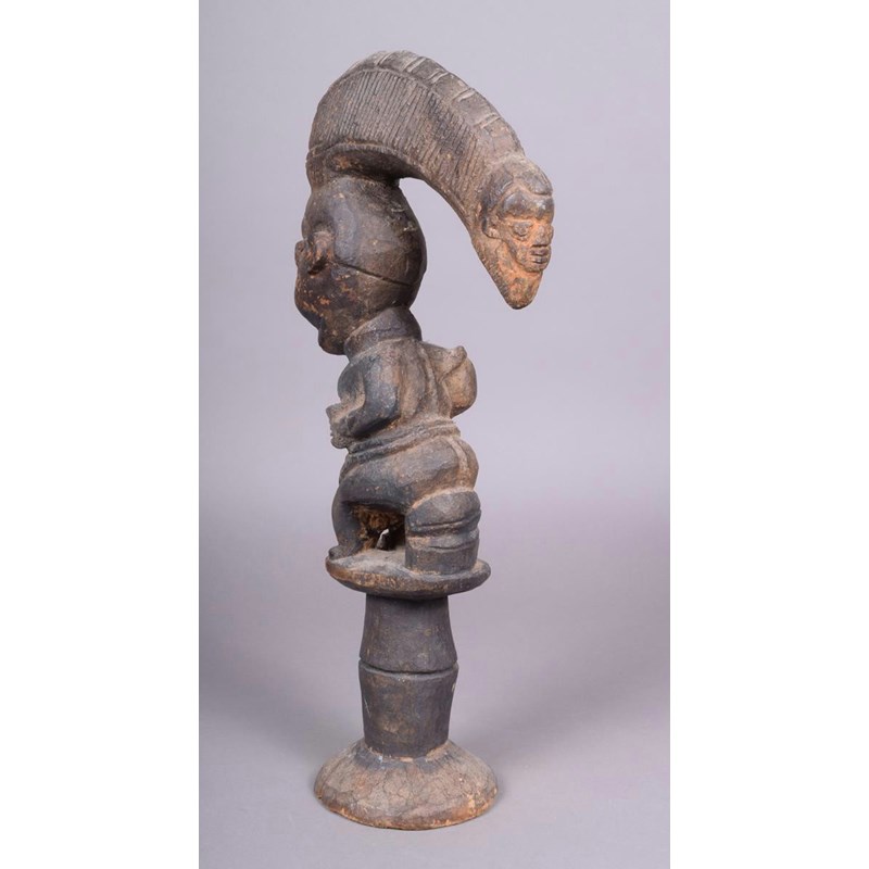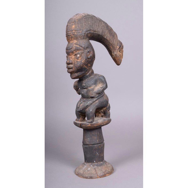 A Yoruba Eshu figure, Nigeria, seated with a scroll coiffure with mask terminal, on a column support, 50cm high.